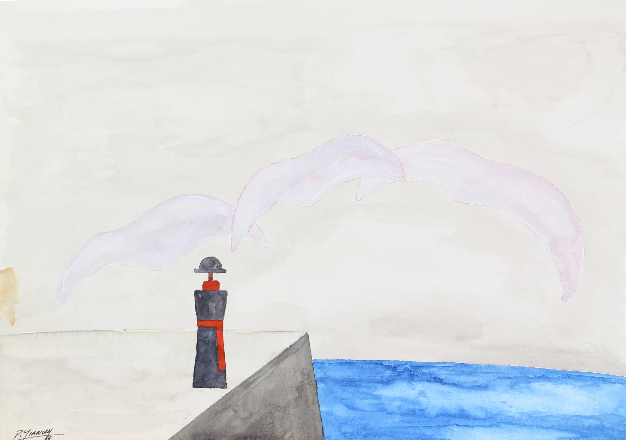 Piero Gianuzzi MOLO CON PRETINO tecnica mista su cartoncino, cm 50,5x73...