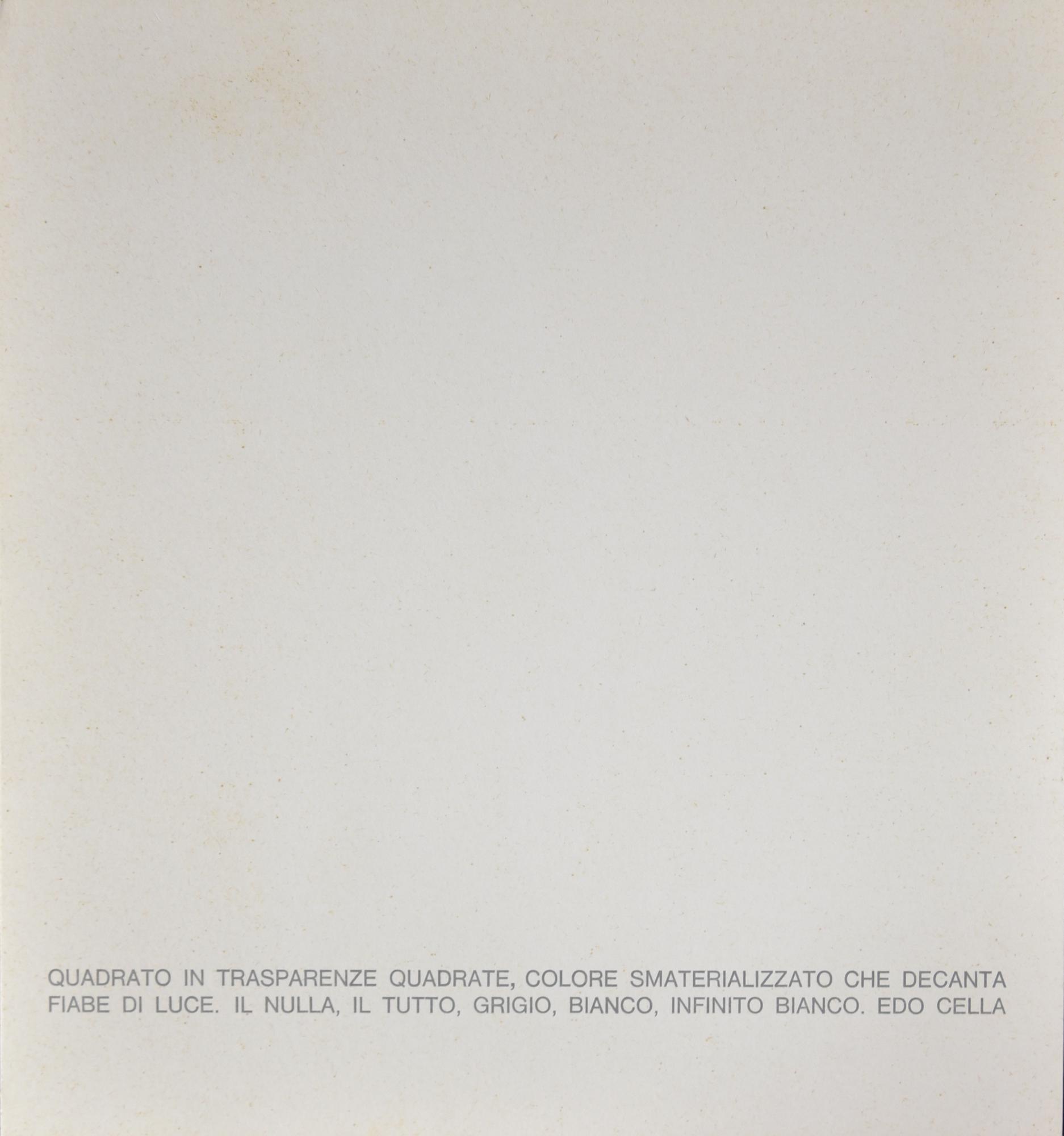 QUADRATO IN TRASPARENZE QUADRATE, COLORE SMATERIALIZZATO CHE DECANTA FIABE DI LUCE. IL NULLA, IL TUTTO, GRIGIO, BIANCO, INFINITO BIANCO. EDO CELLA