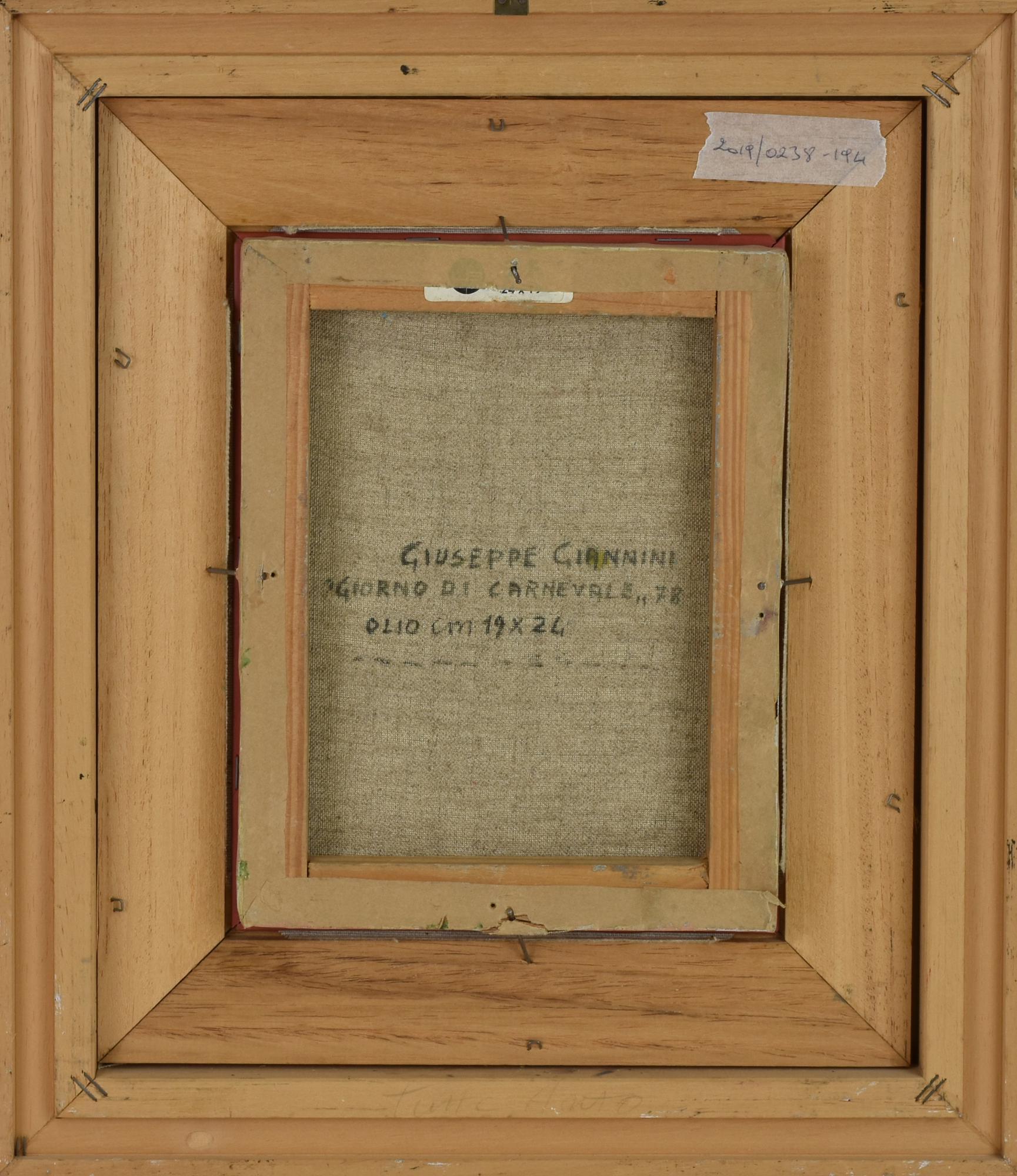 Giuseppe Giannini GIORNO DI CARNEVALE olio su tela, cm 24x19 firma sul retro:...