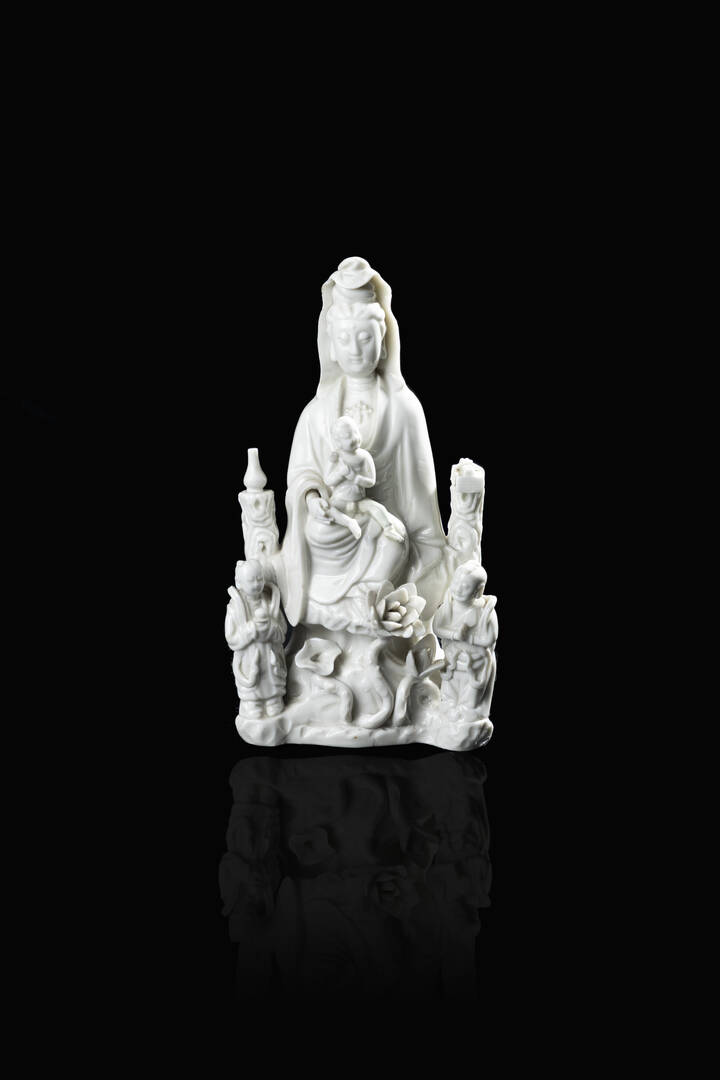 Guanyin in porcellana Blanc de Chine seduta con fanciulli, Cina Dehua, dinastia Qing, epoca Kangxi (1662-1722).