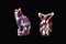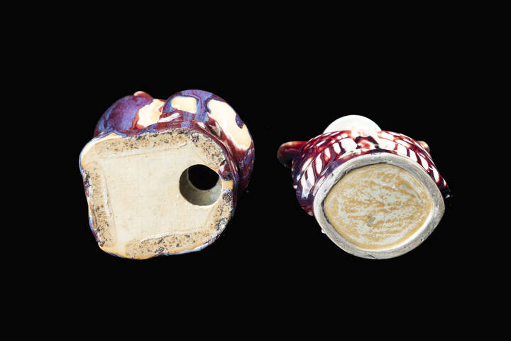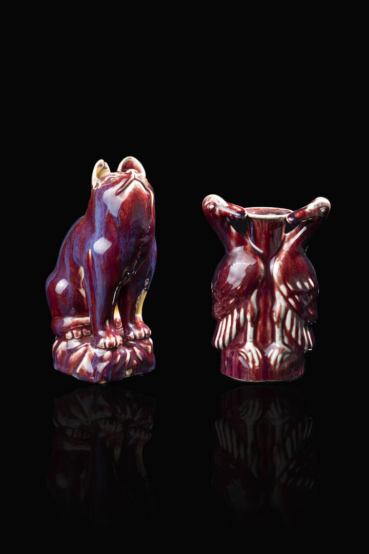 Lotto composto da un vaso con manici a forma d' uccelli e una scultura a forma di gatto, in porcellana sangue di bue, Cina, dinastia Qing, XVIII secolo.