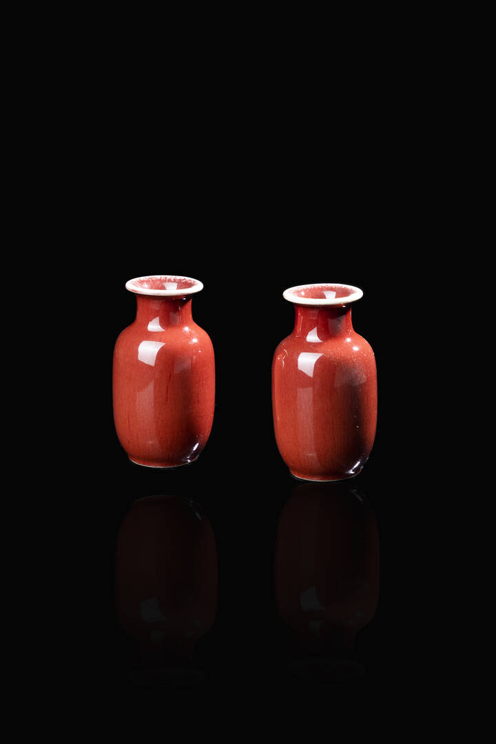 Coppia di piccoli vasi, in porcellana sangue di bue, Cina, dinastia Qing, XX secolo.
