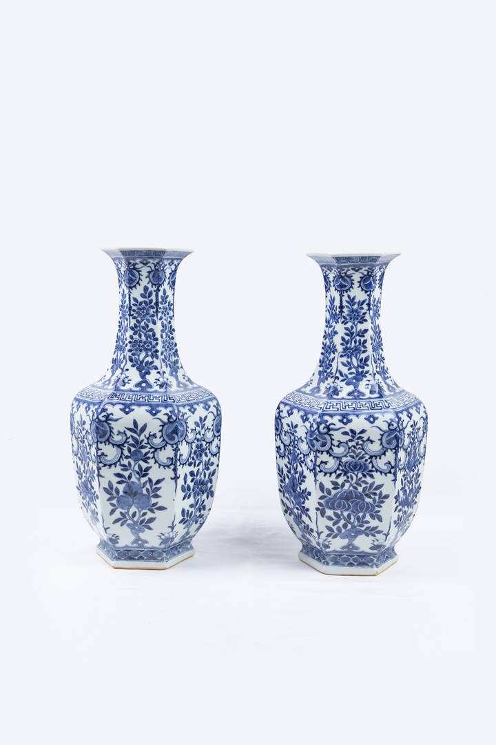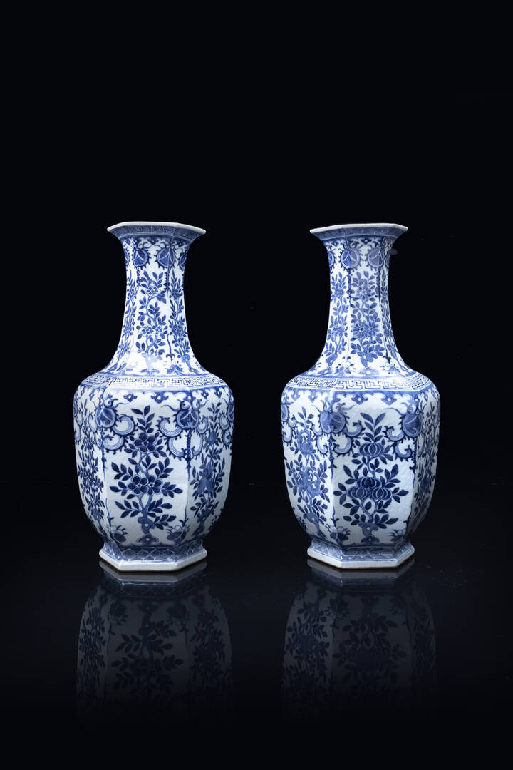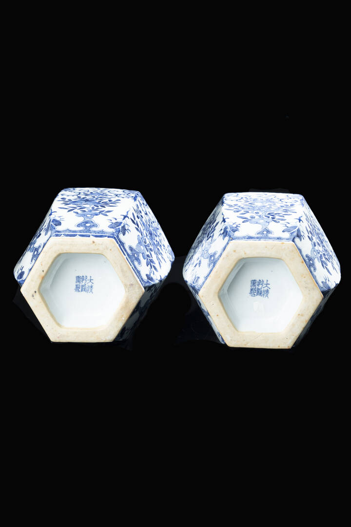 Coppia di vasi in porcellana bianca e blu, marchio apocrifo Qianlong, Cina, dinastia Qing, XIX secolo.