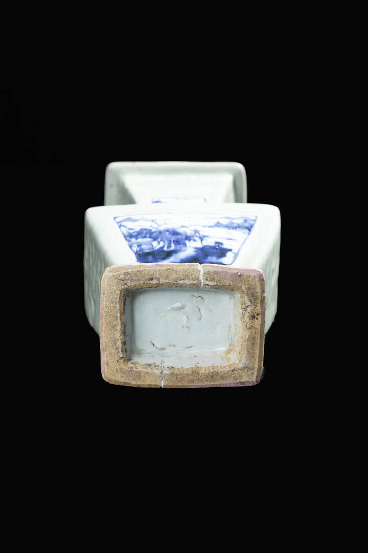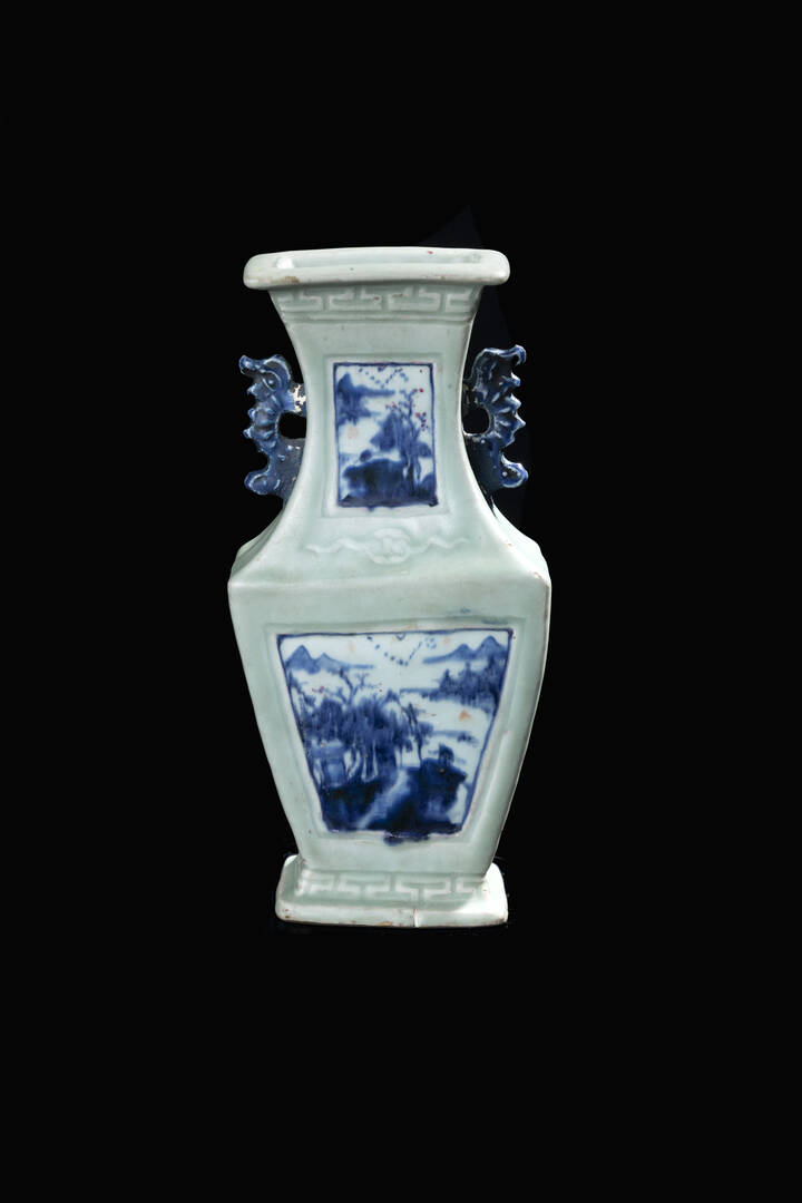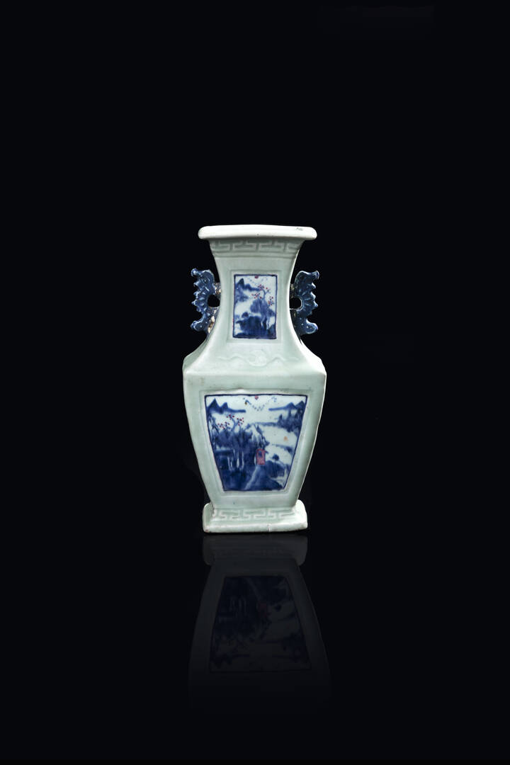 Vaso in porcellana color celadon con anse e dipinti di paesaggio sui toni del blu, Cina, dinastia Qing, epoca Qianglong (1735-1795).