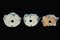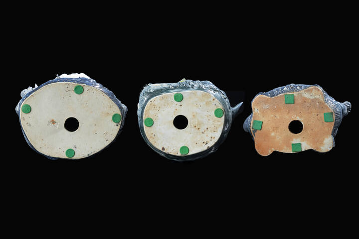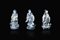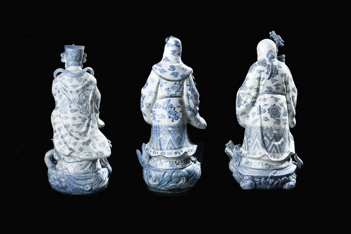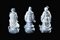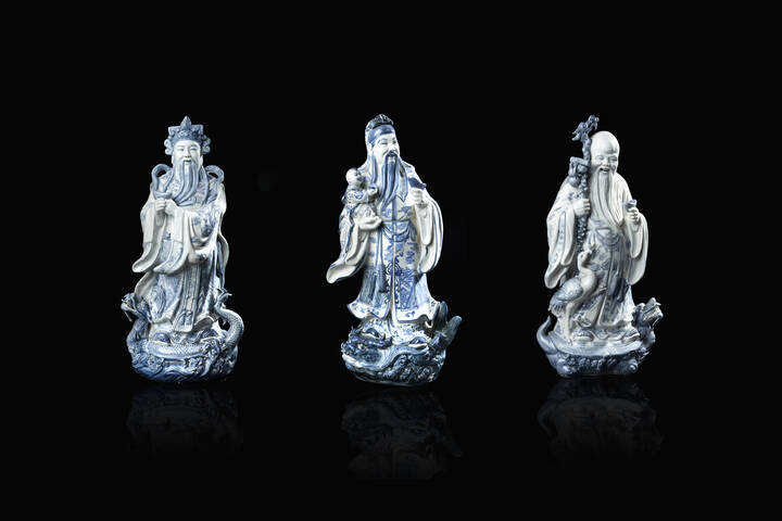 Tre figure in porcellana bianca e blu rappresentanti saggi, Cina, XX secolo.