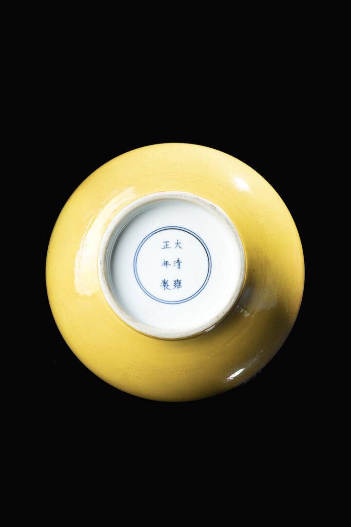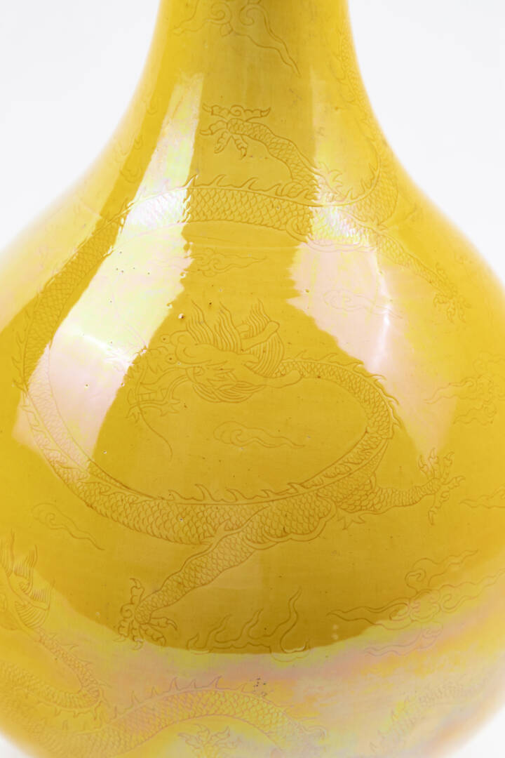 Vaso a bottiglia in porcellana gialla con decoro invisibile raffigurante drago, Cina, fine dinastia
