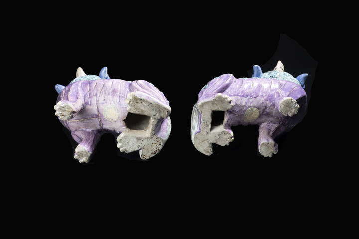 Coppia di cani di Pho in porcellana in smalti policromi, Cina, dinastia Qing, XIX secolo.