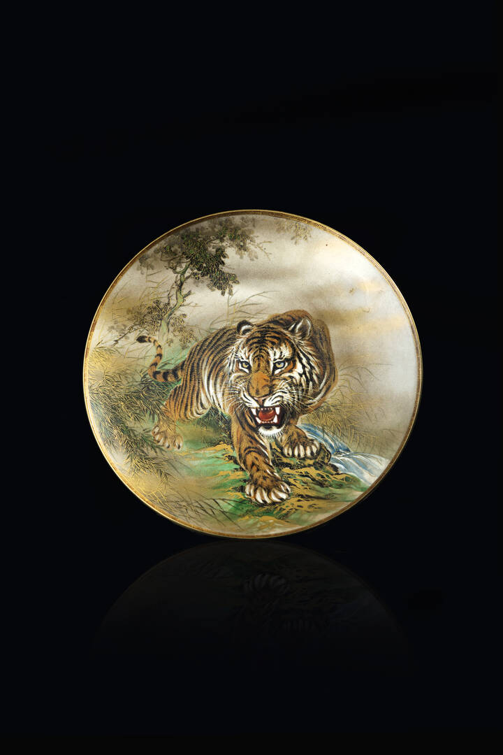 Piatto in porcellana Satsuma decorato con una tigre, Giappone, XX secolo.