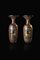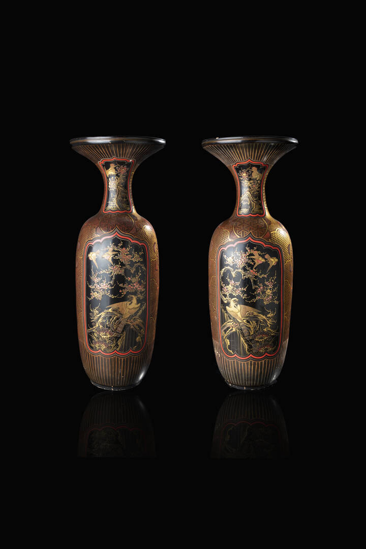 Coppia di vasi in porcellana smaltata sui toni dell'oro, raffigurante paesaggio con uccelli, Giappone, XX secolo.
