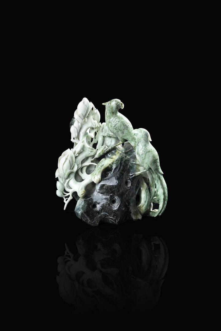 Scultura in giada verde raffigurante due uccelli posati su un ramo, Cina, Repubblica, XX secolo.