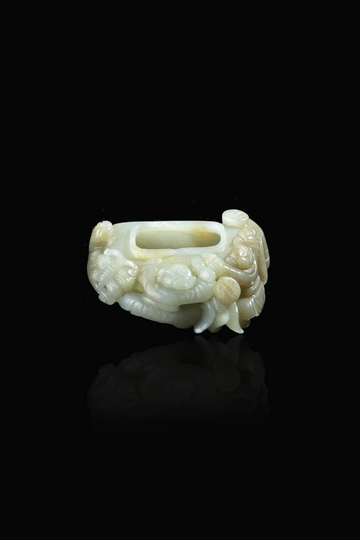 Sciacquapennelli in giada celadon con personaggi e fiore di loto, Cina, dinastia Qing, XIX secolo.