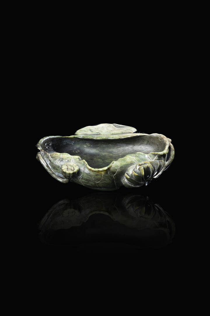 Sciacqua pennelli in giada spinacio a forma di fiore di loto, Cina, dinastia Qing, XIX secolo.