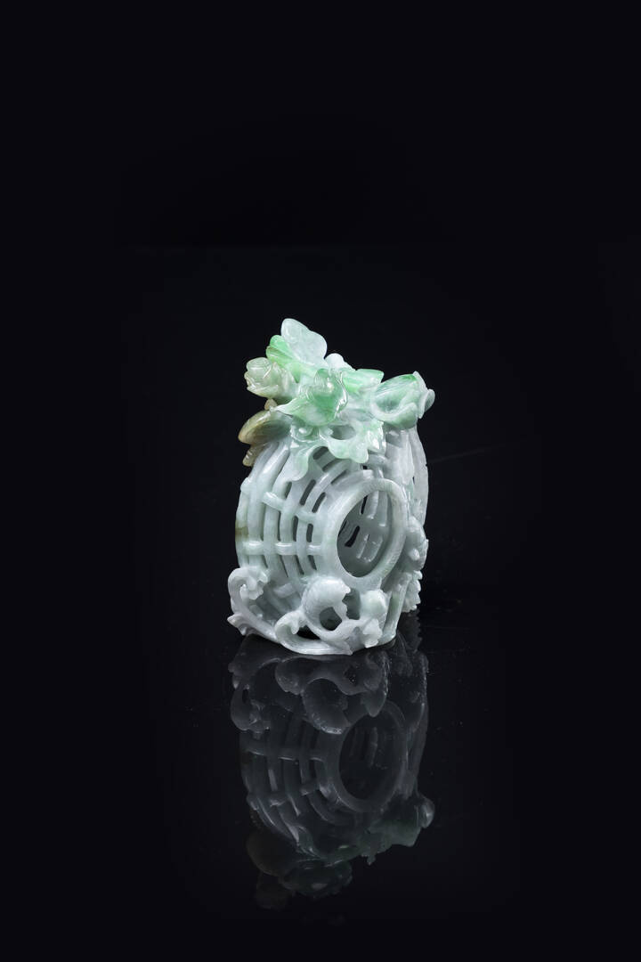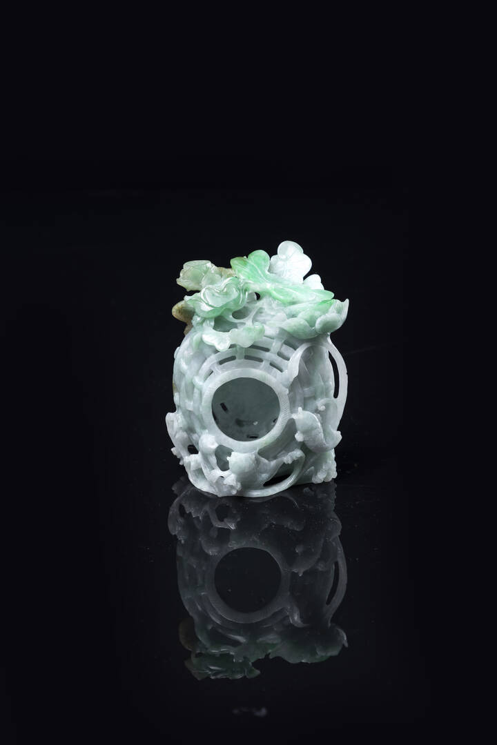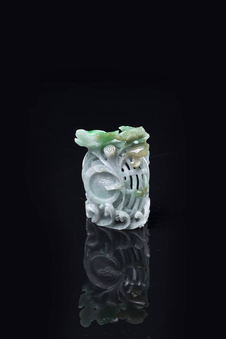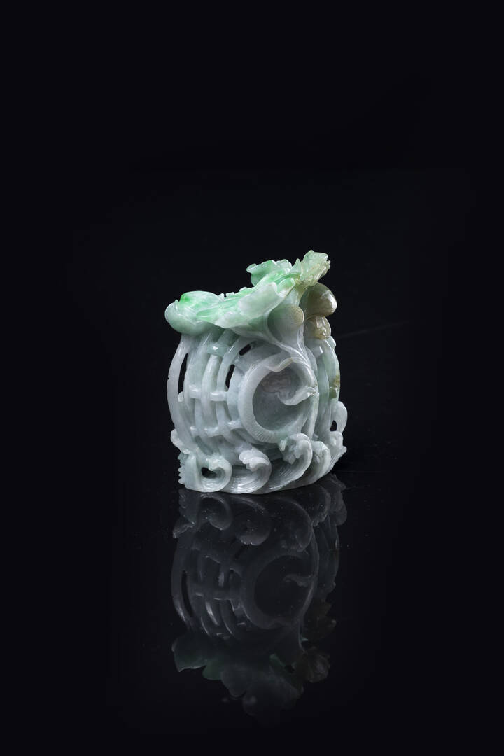 Sciacqua pennelli in giada verde con decoro vegetale e pesci in rilievo, Cina, dinastia Qing, XIX secolo.