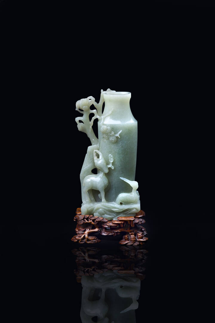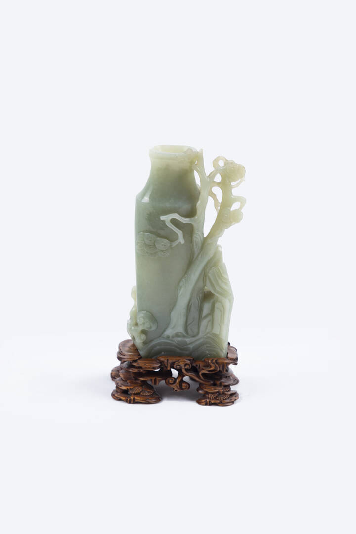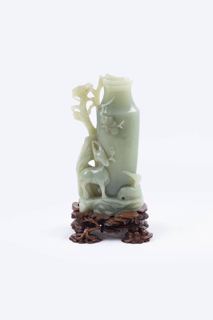 Vaso in giada celadon con decoro a rilievo raffigurante fenice e animali tra rami, Cina, dinastia