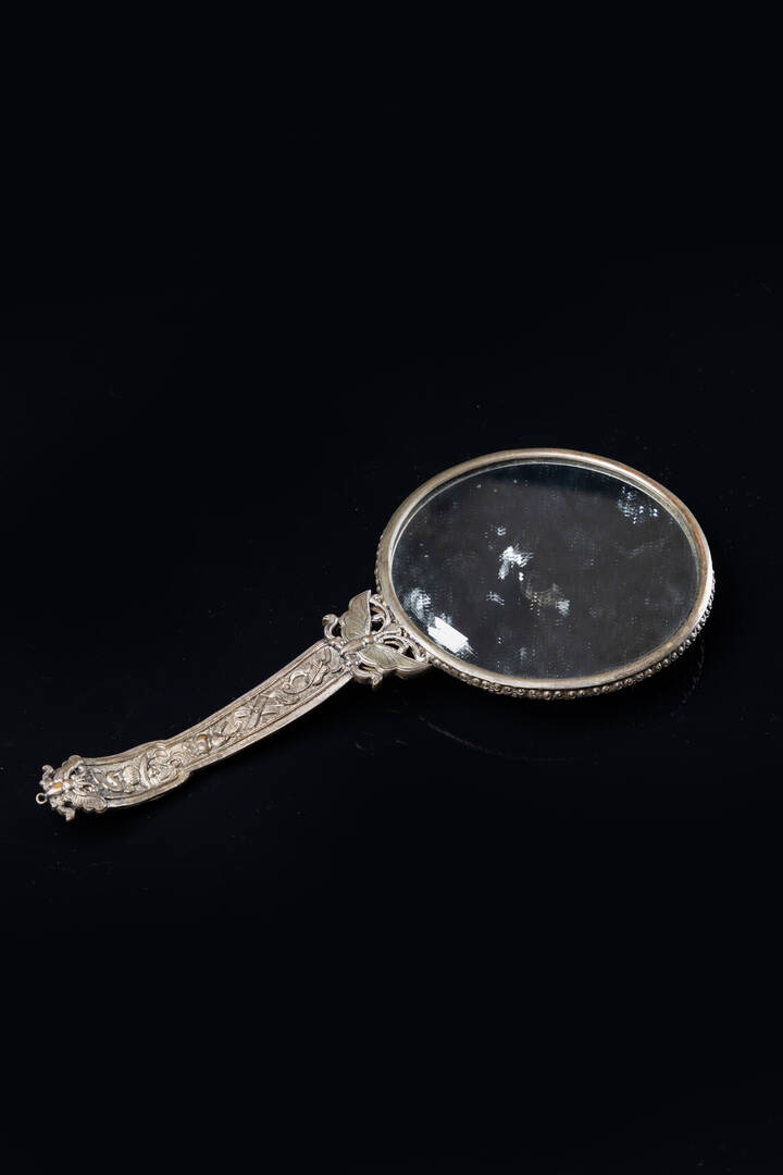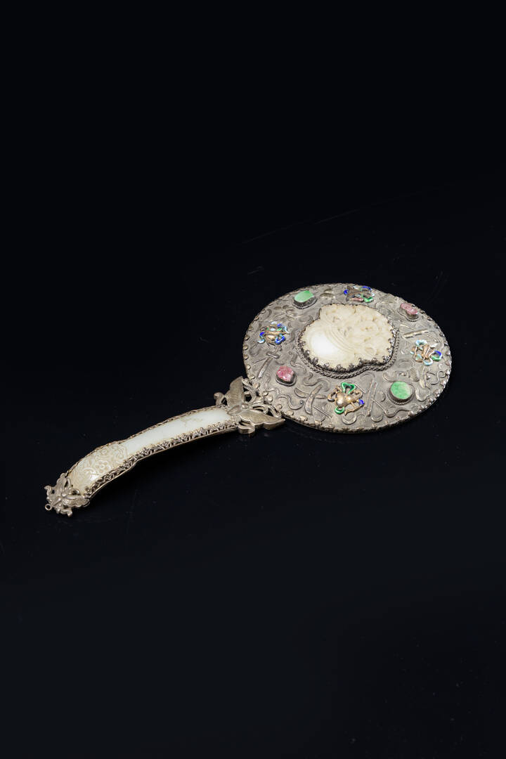 Specchio in smalto, giada e pietre dure, Cina dinasta Qing, XX secolo.