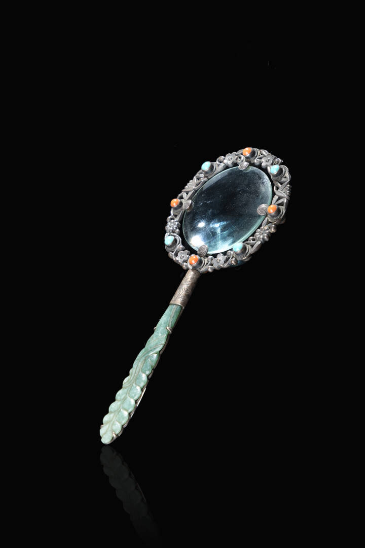 Lente in argento e pietre dure con manico in giada, Cina, dinastia Qing, XIX secolo.
