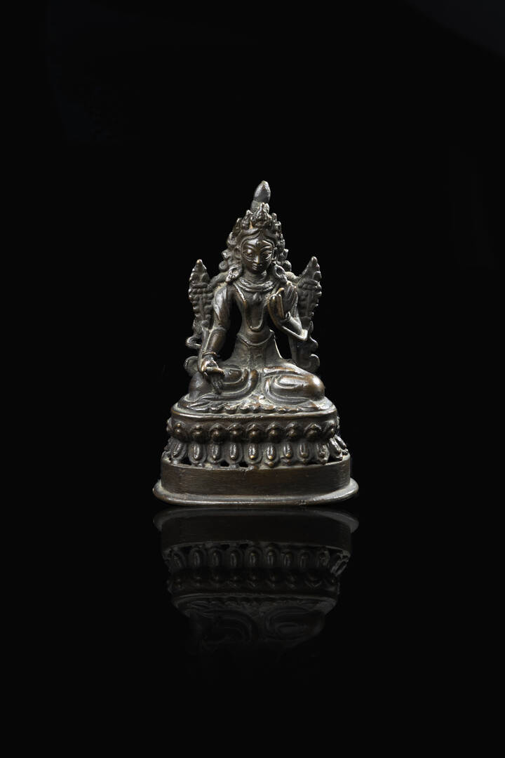 Figura di Prajnaparamita su doppio fiore di loto in bronzo, Nepal, XVIII secolo.
