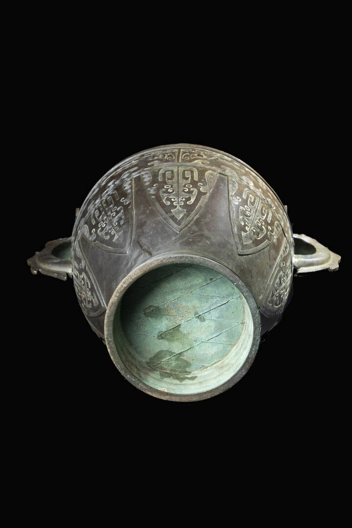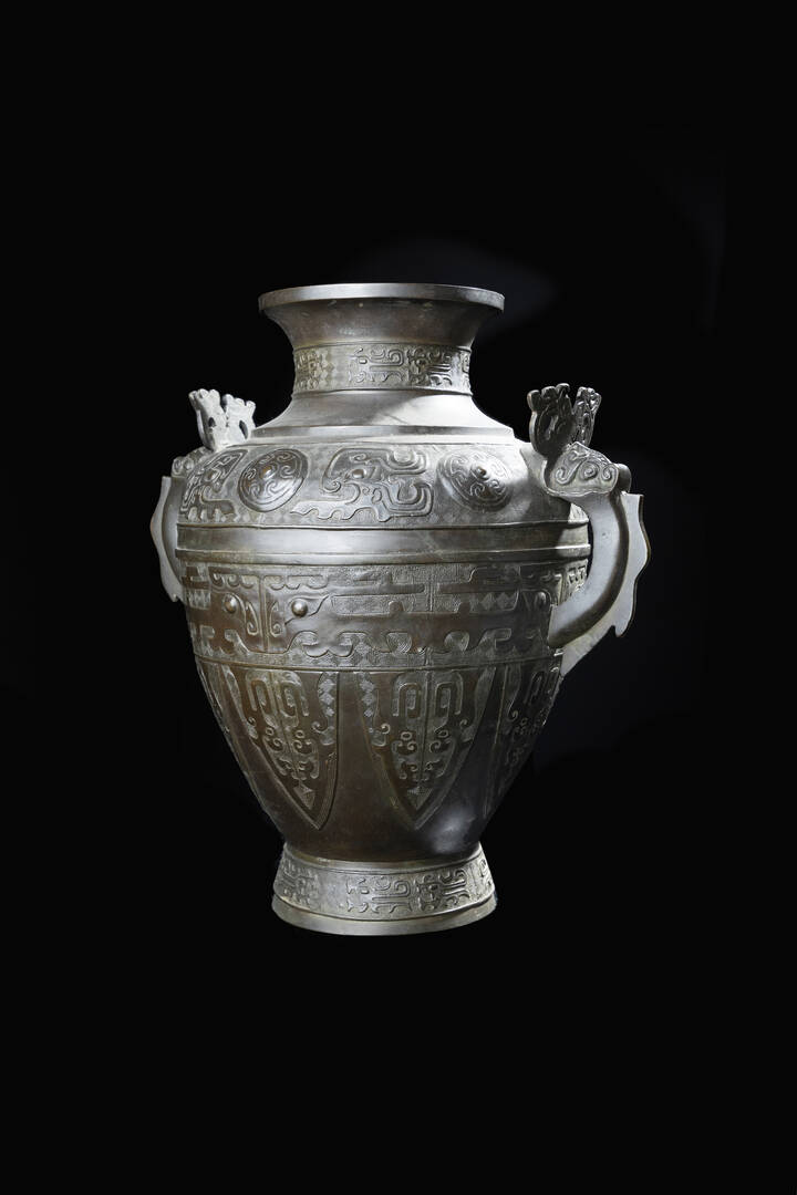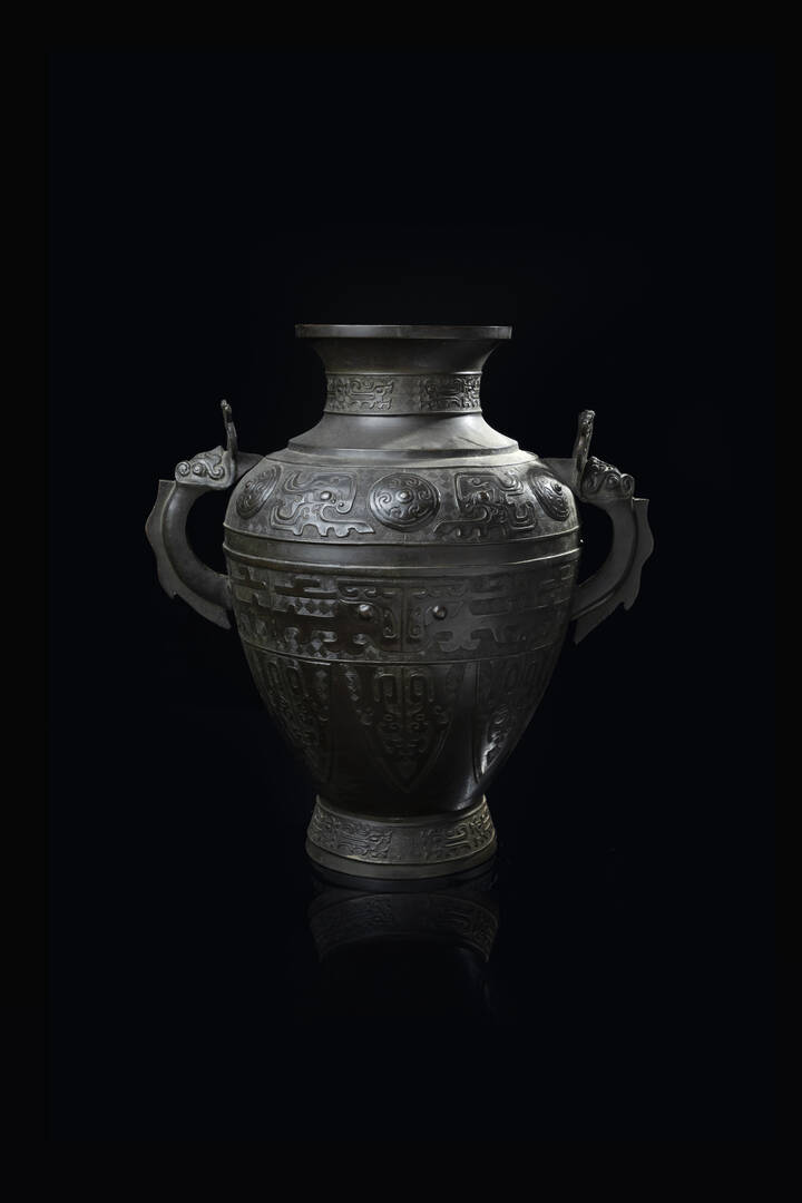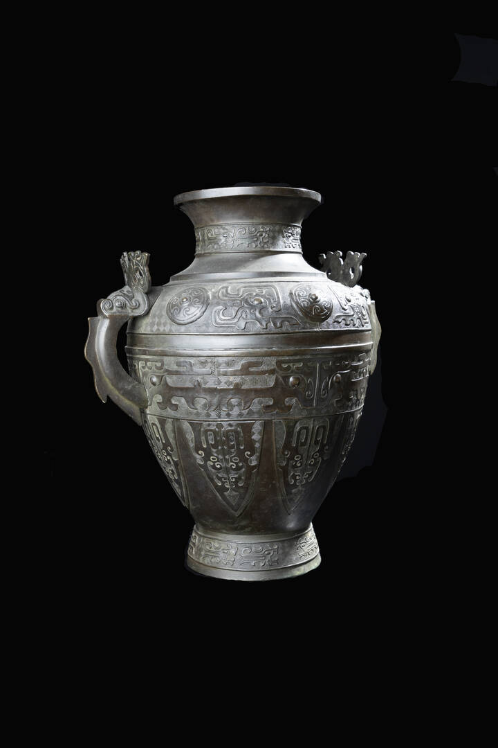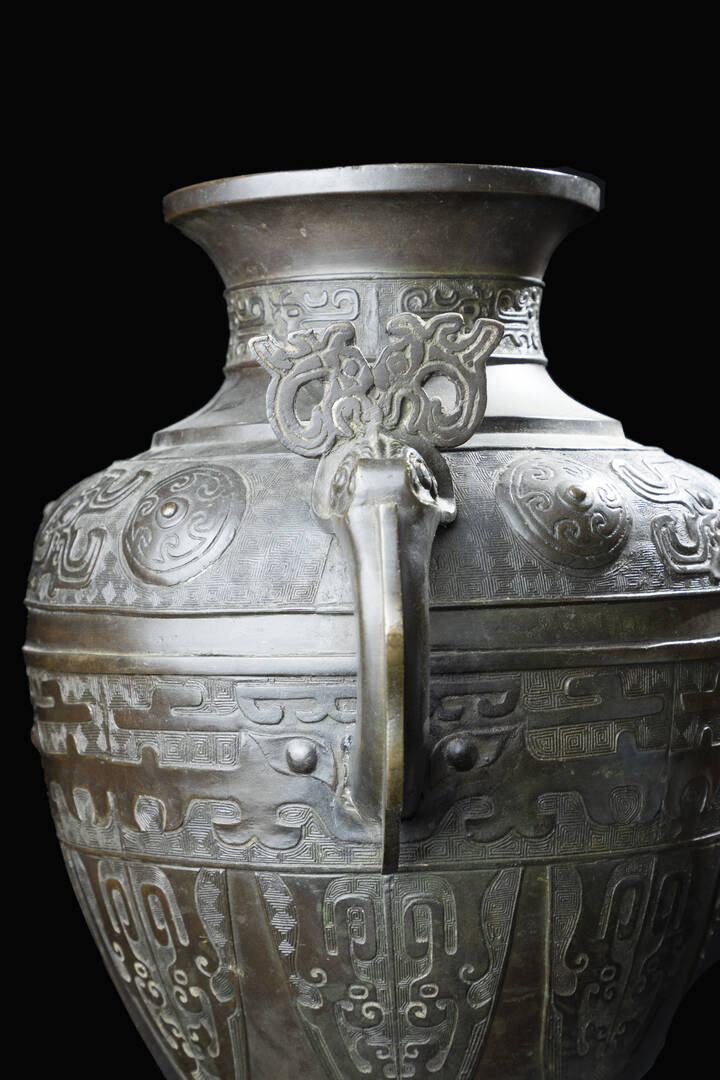 Vaso in bronzo a doppia ansa con decoro geometrico di stile arcaico, Cina, dinastia Ming, XVII secolo.