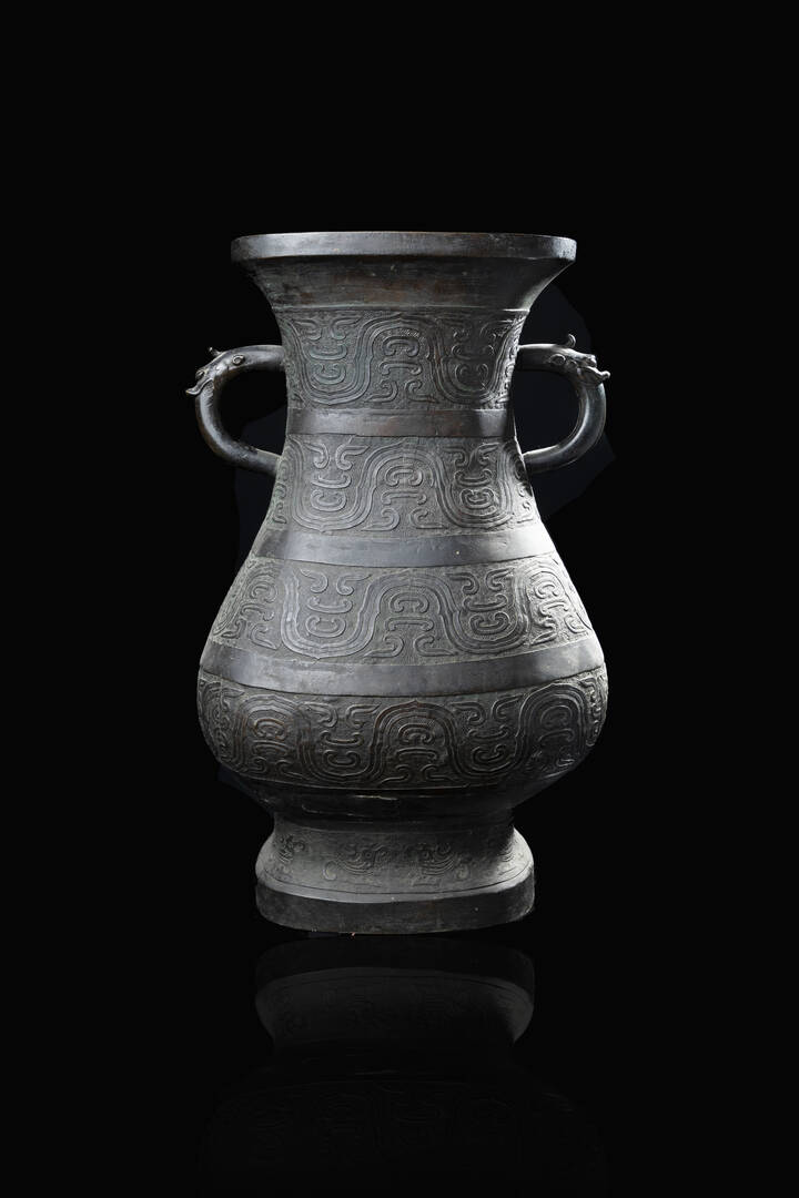 Grande vaso in bronzo con decori arcaici e manici a forma di drago, Cina, dinastia Ming, XVII secolo.