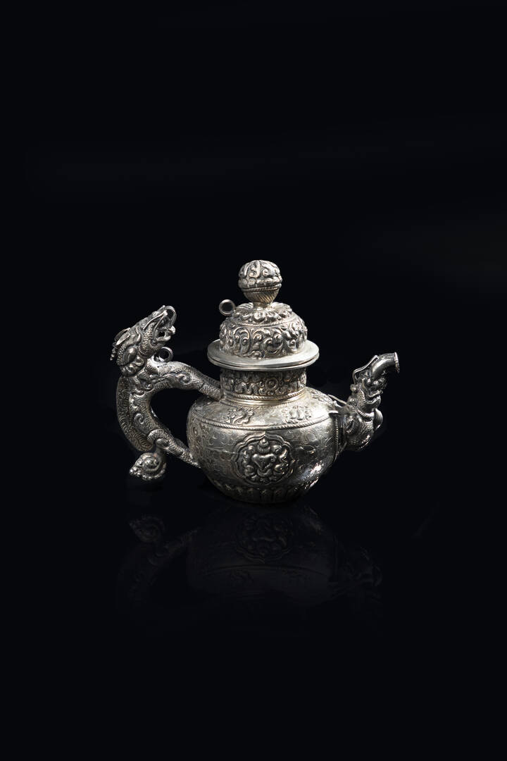 Piccola teiera in argento sbalzato, Tibet, XIX secolo.