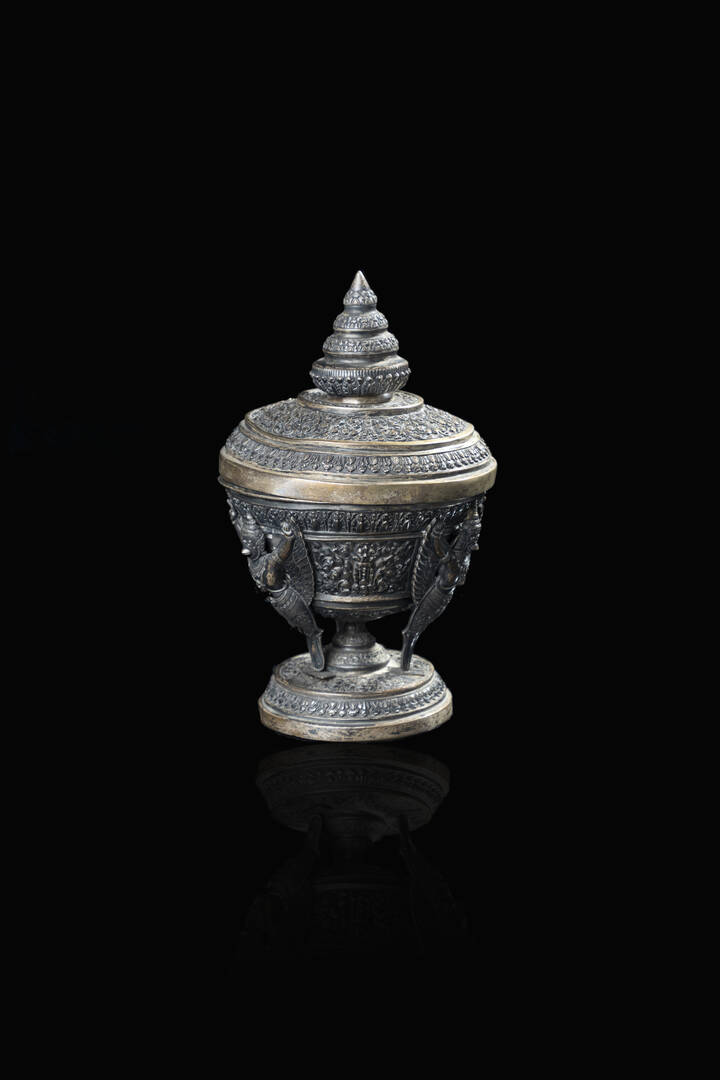 Stupa in argento sbalzato eretto da tre Garuda, Thailandia, XIX secolo.