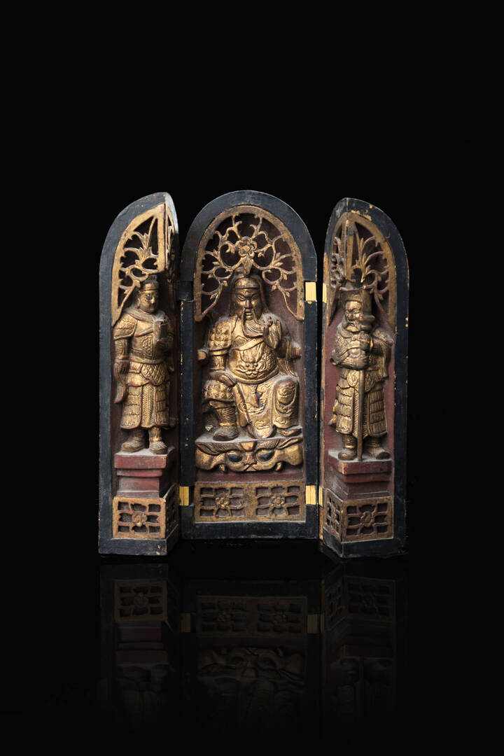 Preghiera da viaggio in legno dorato, Cina, XIX secolo.