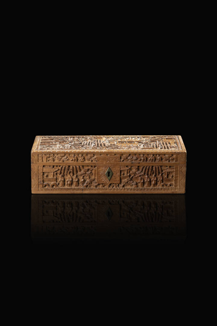 Scatola con personaggi in legno intagliato, Cina Canton, XIX secolo.