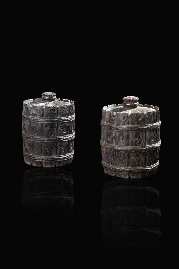Coppia di contenitori in legno con tappo a forma di barile, Cina, dinastia Qing, XIX secolo.