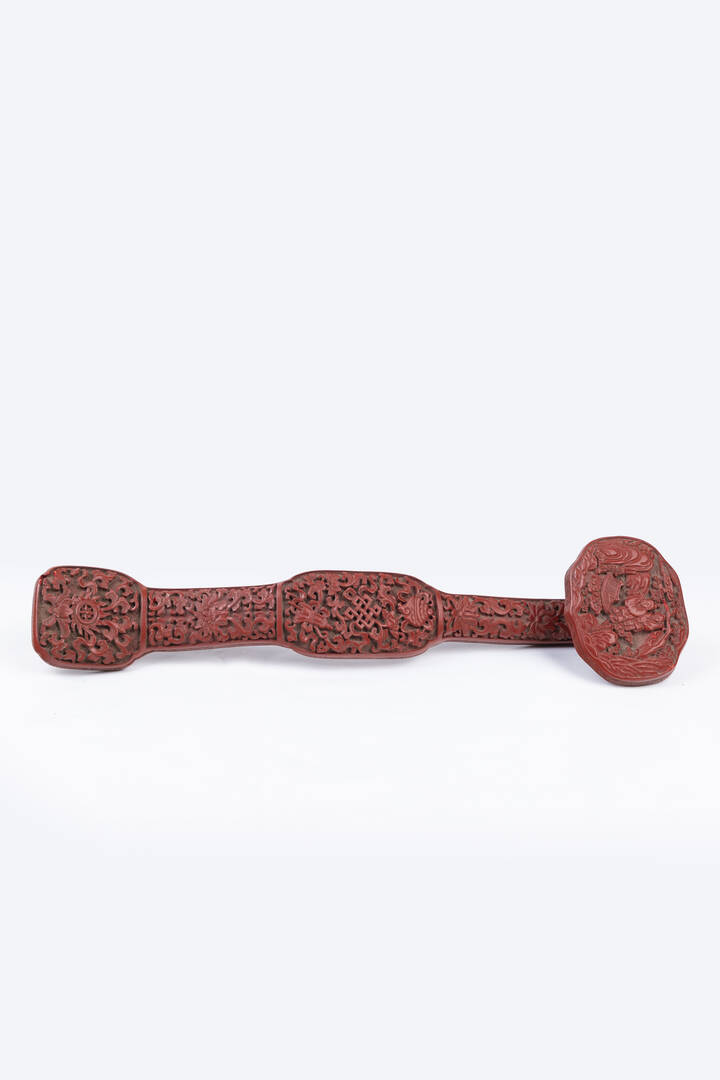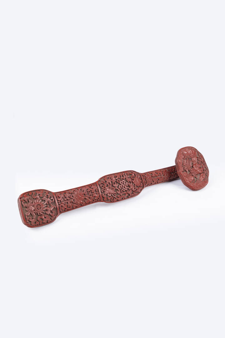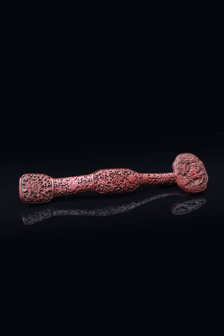 Ruyi in lacca rossa con immagine di saggi entro peasaggio, Cina, dinastia Qing, XIX secolo.