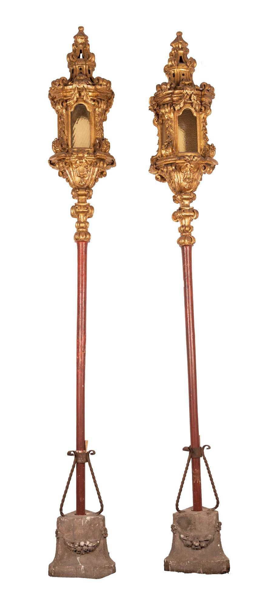 Manifattura veneta del XVII secolo ( - ) Coppia di lampioni da processione Legno intagliato e dorato altezza cm 250 totale / altezza cm 102 lanterna