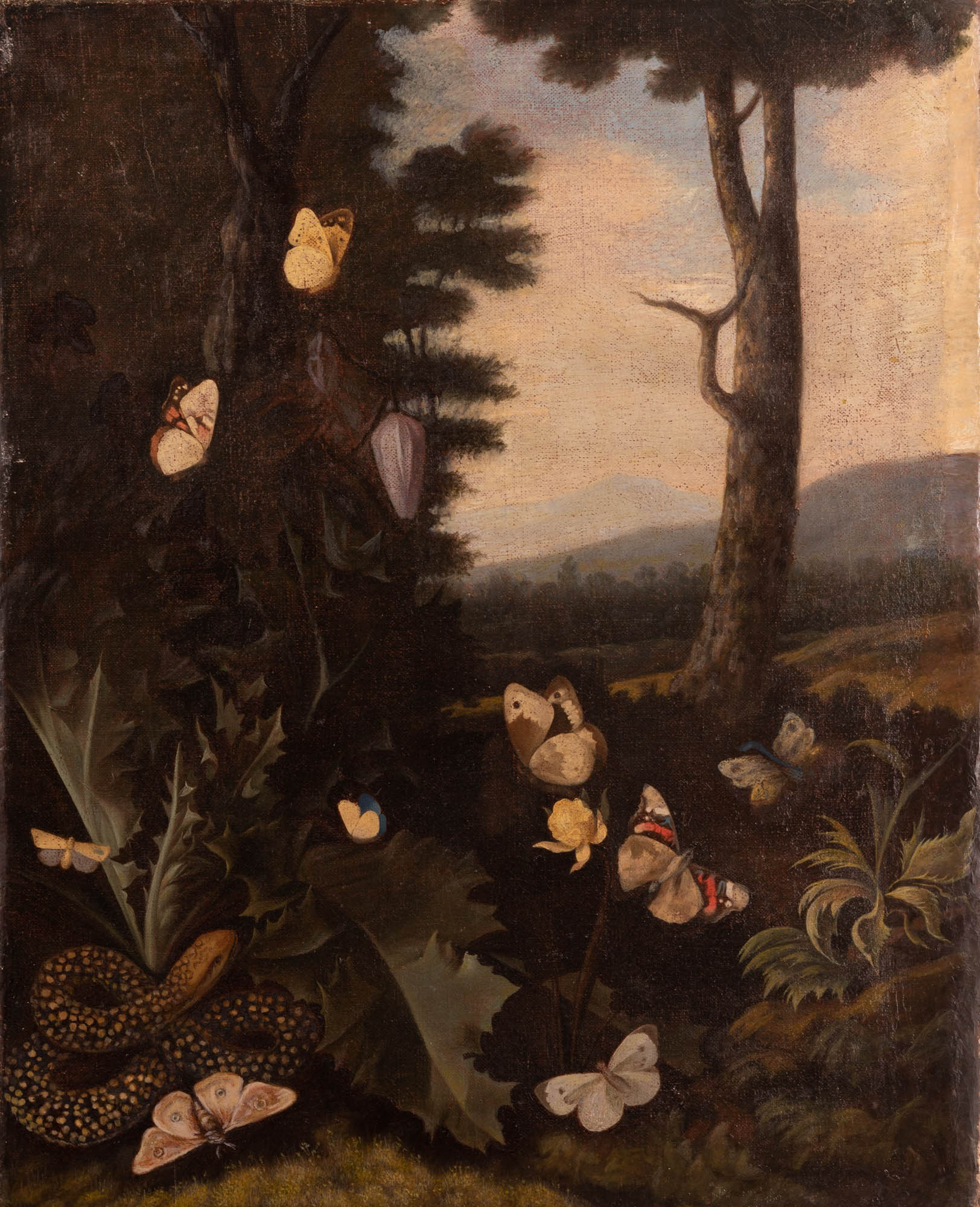 Scuola olandese del XVII secolo ( - ) Paesaggio con farfalle e serpente olio su tela cm 57x46