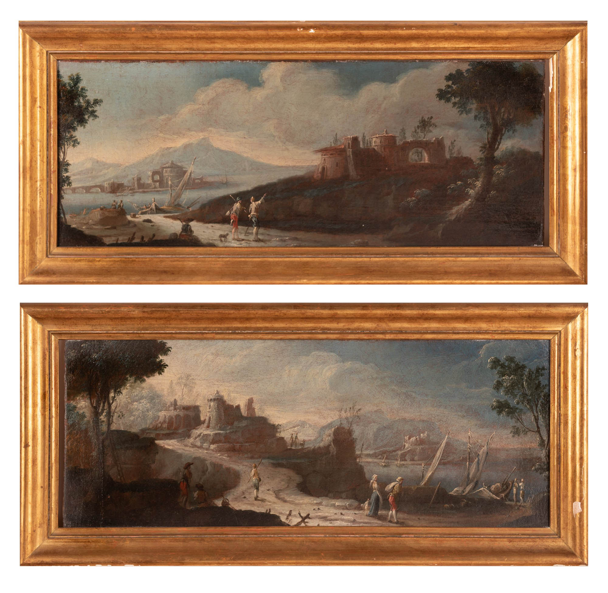 Scuola veneta XVIII secolo ( - ) Coppia di capricci con figure e barche Olio su tela cm 24x63
