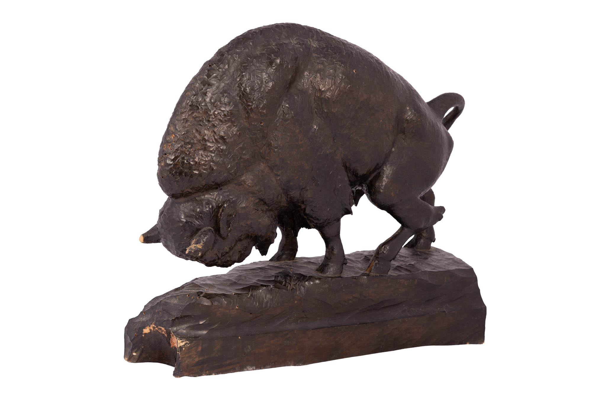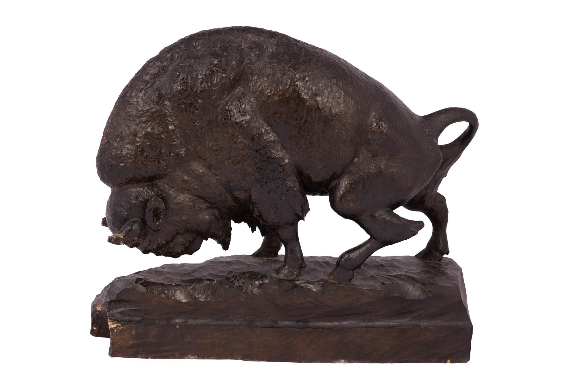 Manifattura americana del XX secolo ( - ) Scultura raffigurante Bufalo Legno patinato scuro altezza cm 33 / base 36x9
