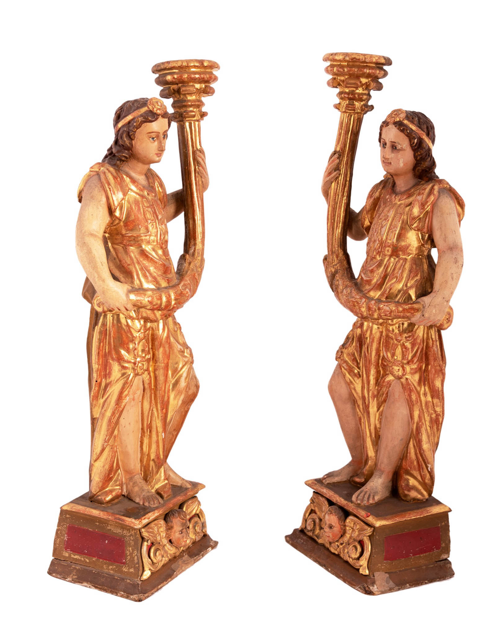 Manifattura dell'Italia del nord del XIX secolo ( - ) Coppia di angeli portacero Legno intagliato, dipinto e dorato altezza cm 81 / base 25x17
