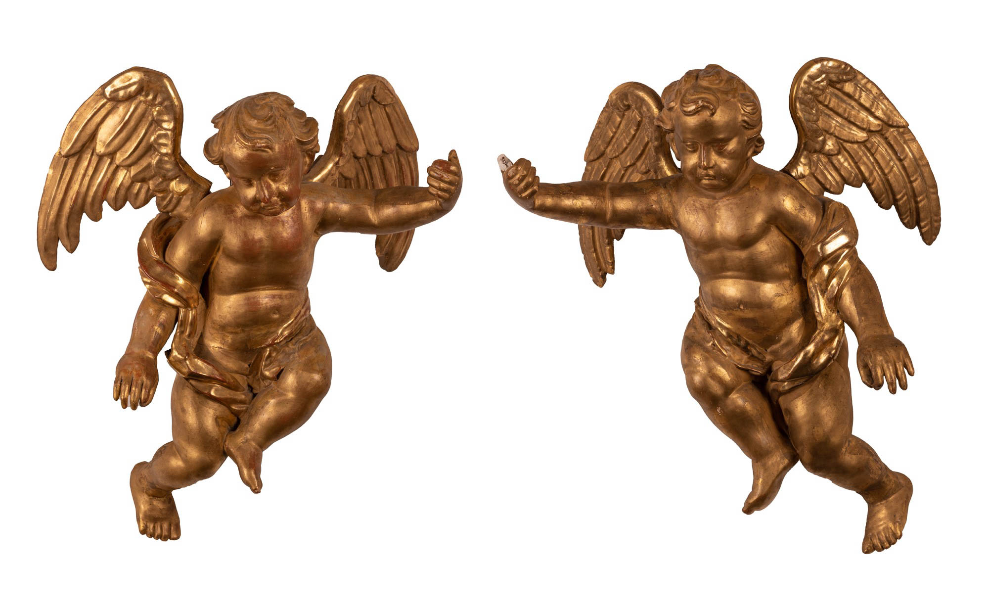 Manifattura romana del XVII secolo ( - ) Coppia di angeli Legno intagliato e dorato altezza 90 circa