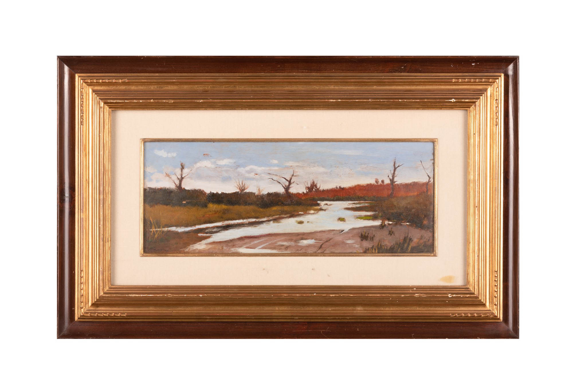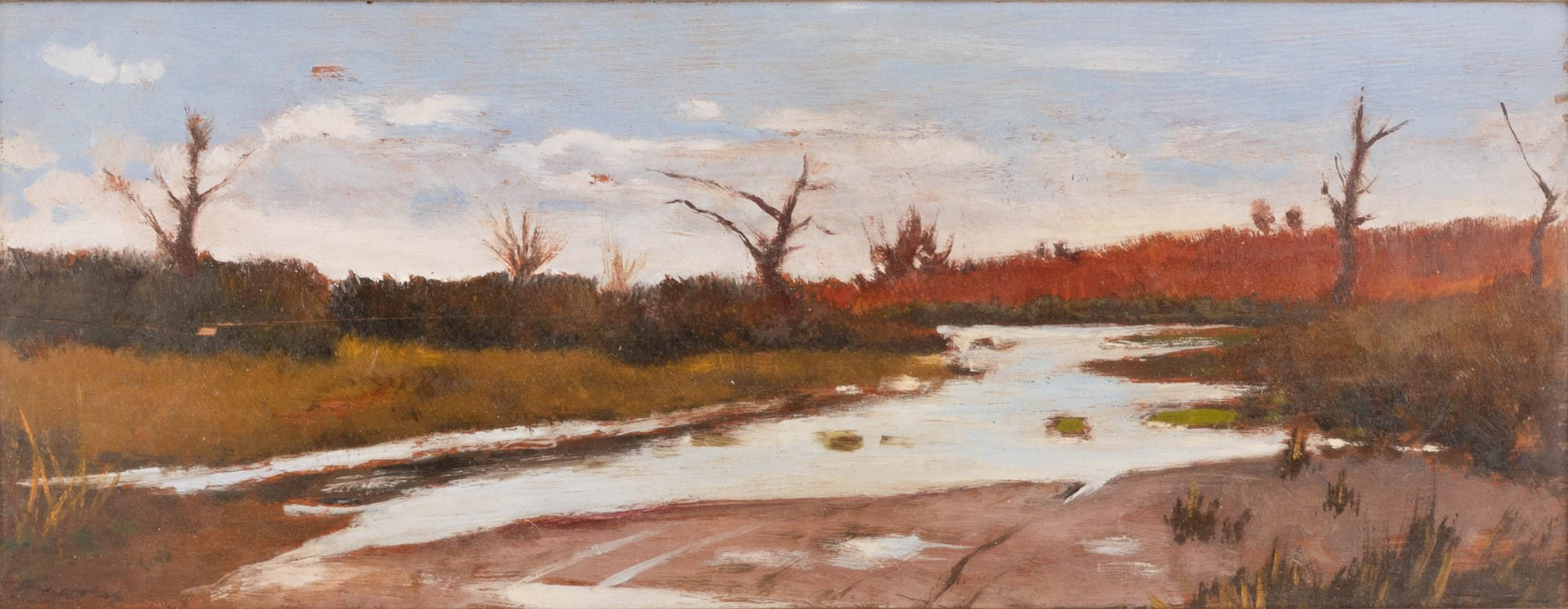 Lotto 122 | Cecconi, Eugenio (Firenze, 1834 - Firenze, 1888) Paesaggio fluviale Olio su tavola cm 15x39