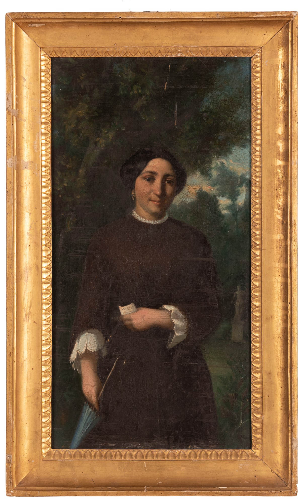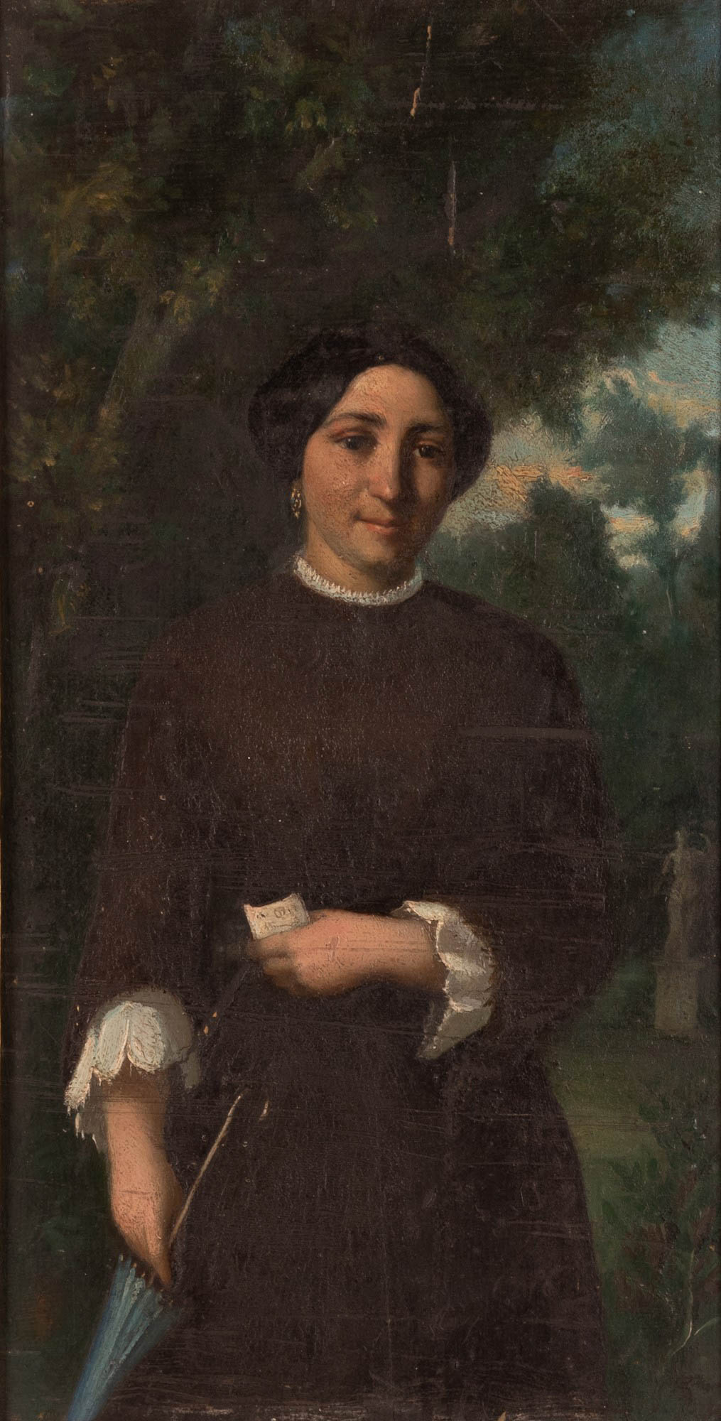 Lotto 137 | Pittore Francese del XIX secolo ( - ) Dama con ombrellino da sole Olio su tavola 37x19