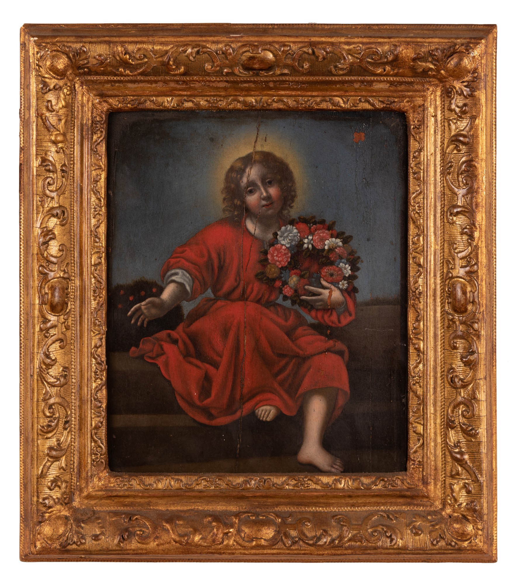 Scuola toscana del XIX secolo ( - ) Gesù con ghirlanda di fiori olio su tavola cm 24x20
