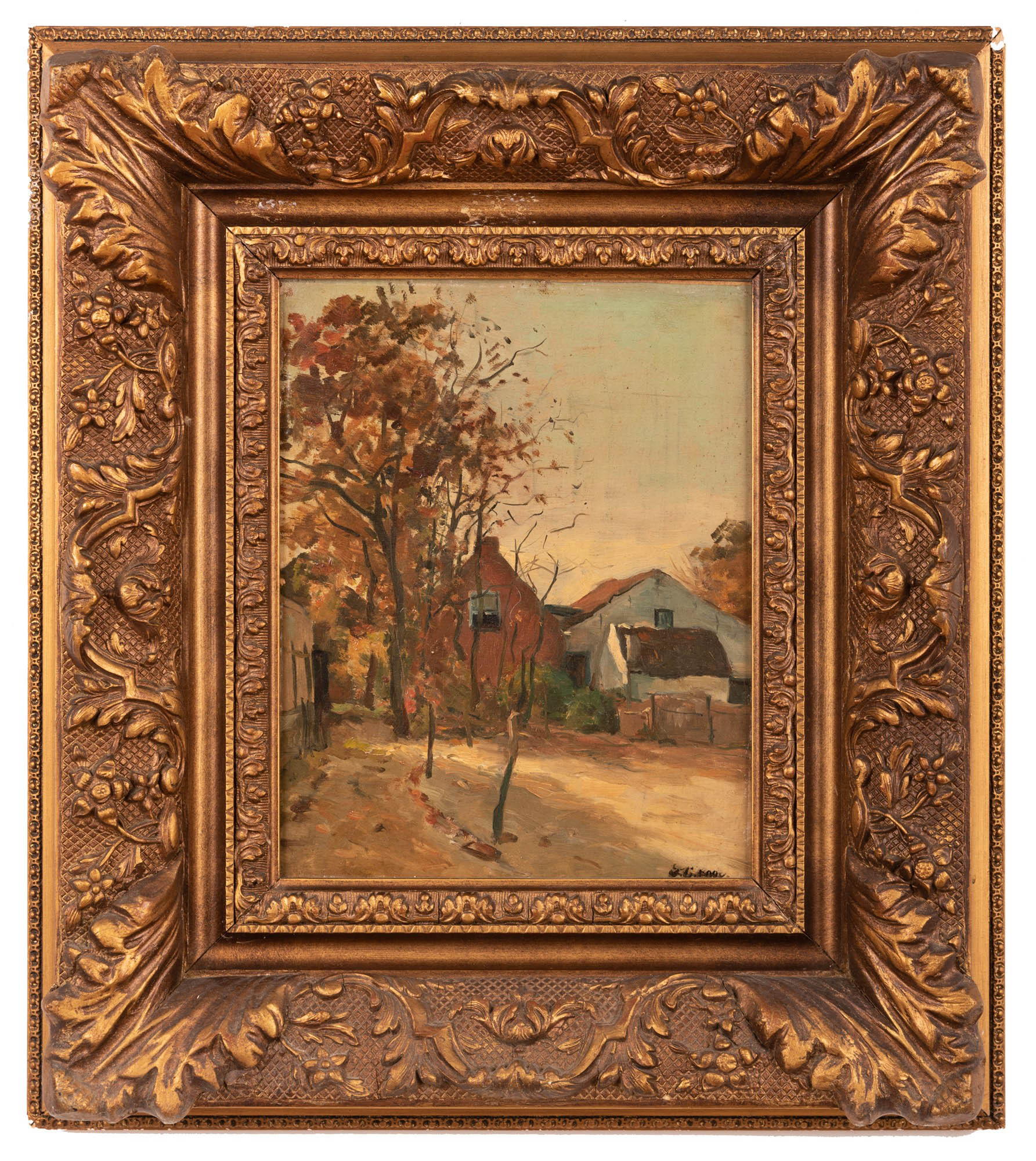 Koot, Pieter Cornelis (Gouda, 1861 - Voorburg, 1921) Scorcio di villaggio Olio su tela applicata su cartone cm 30x25