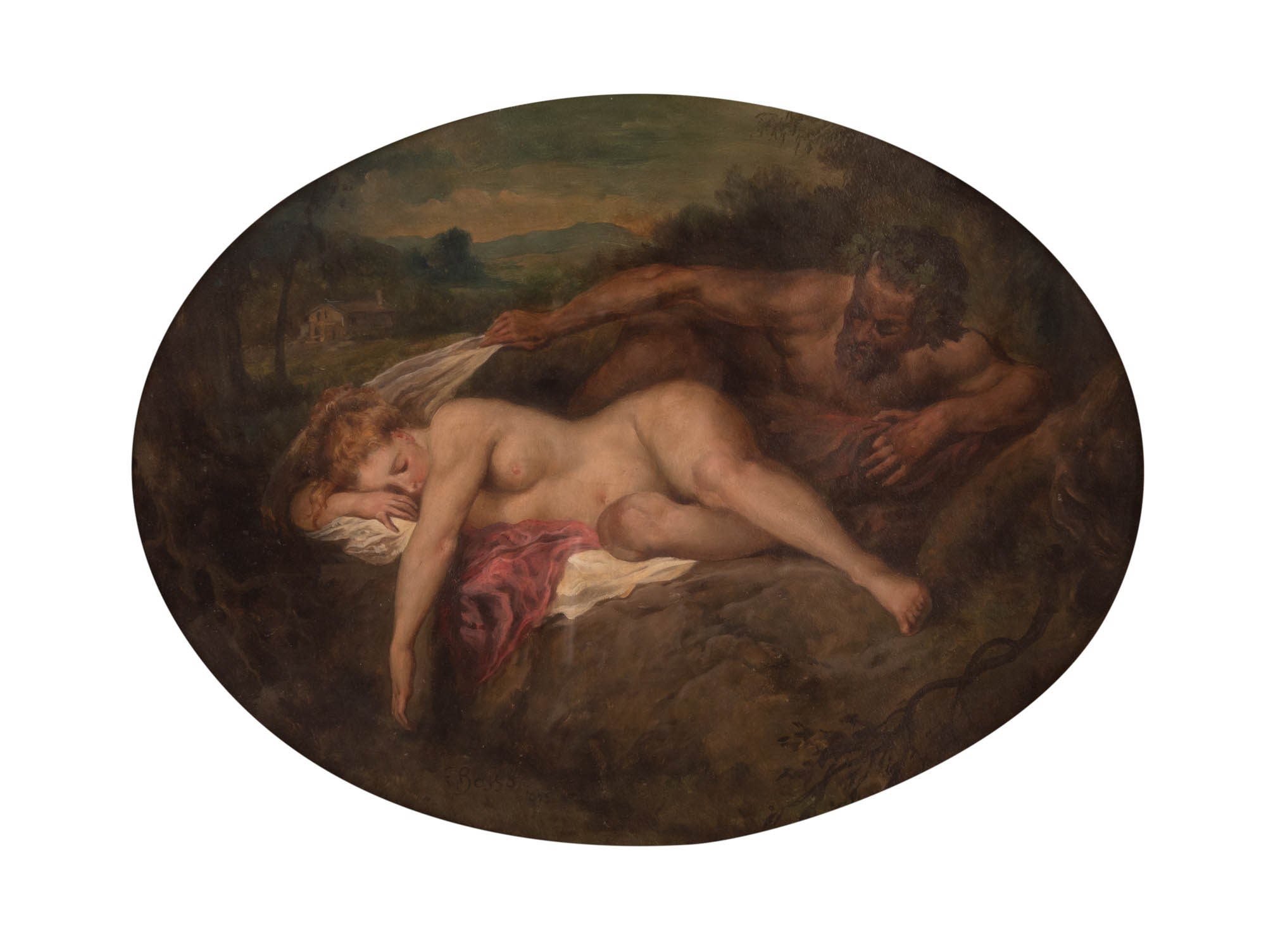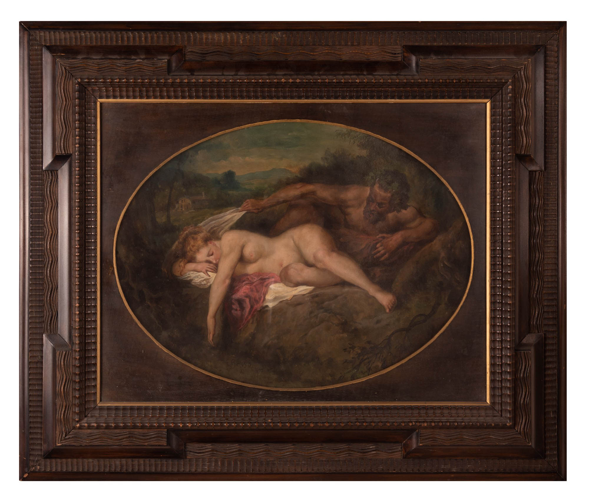 Bosso, Francesco (Vercelli, 1864 - Torino, 1933) Donna con satiro in paesaggio Olio su cartone cm 53x67 ovale in campo rettangolare