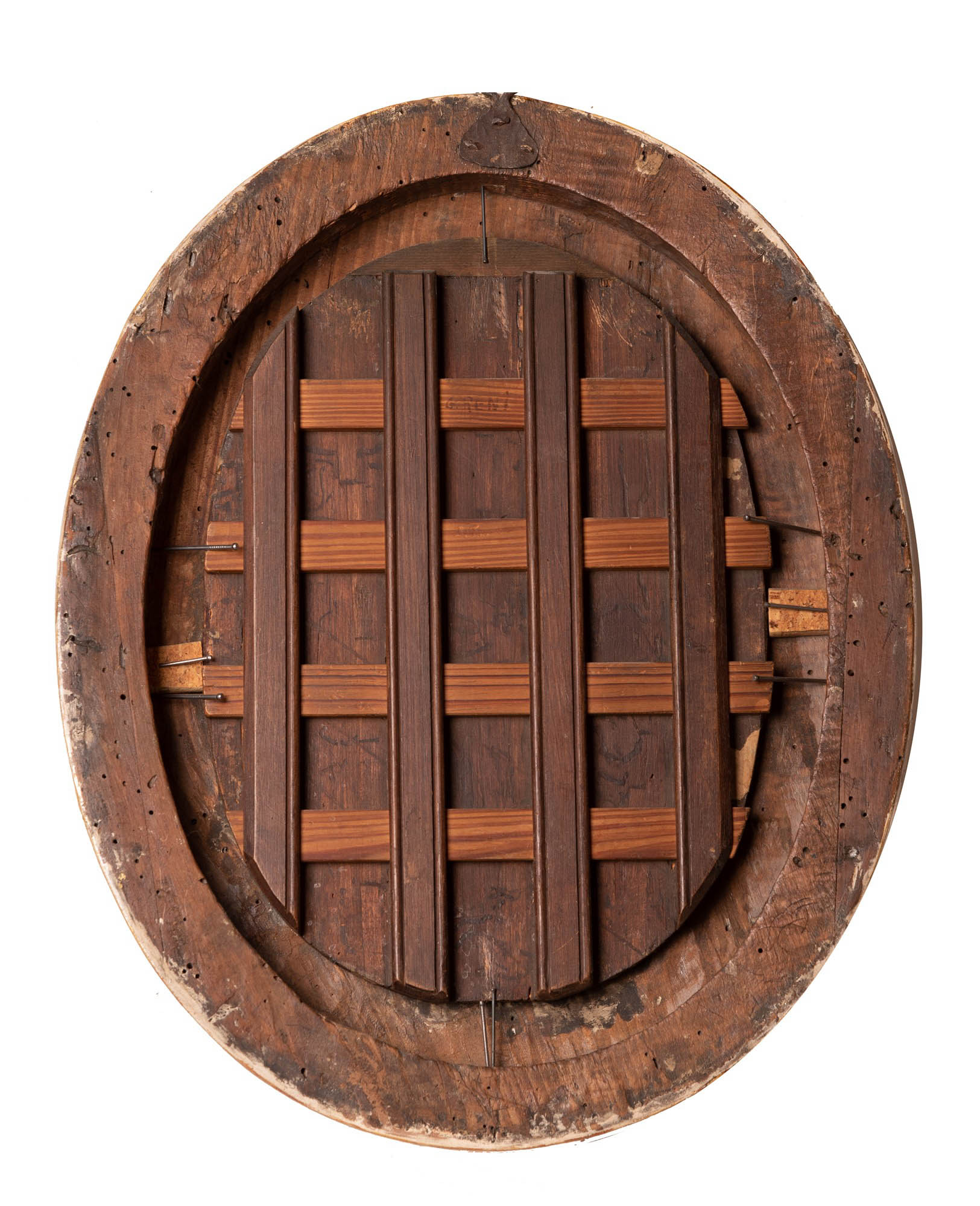 olio su tavola cm 36x26 ovale Cornice di tipo Salvator Rosa a due ordini di intaglio in legno argentato a mecca del XVII secolo