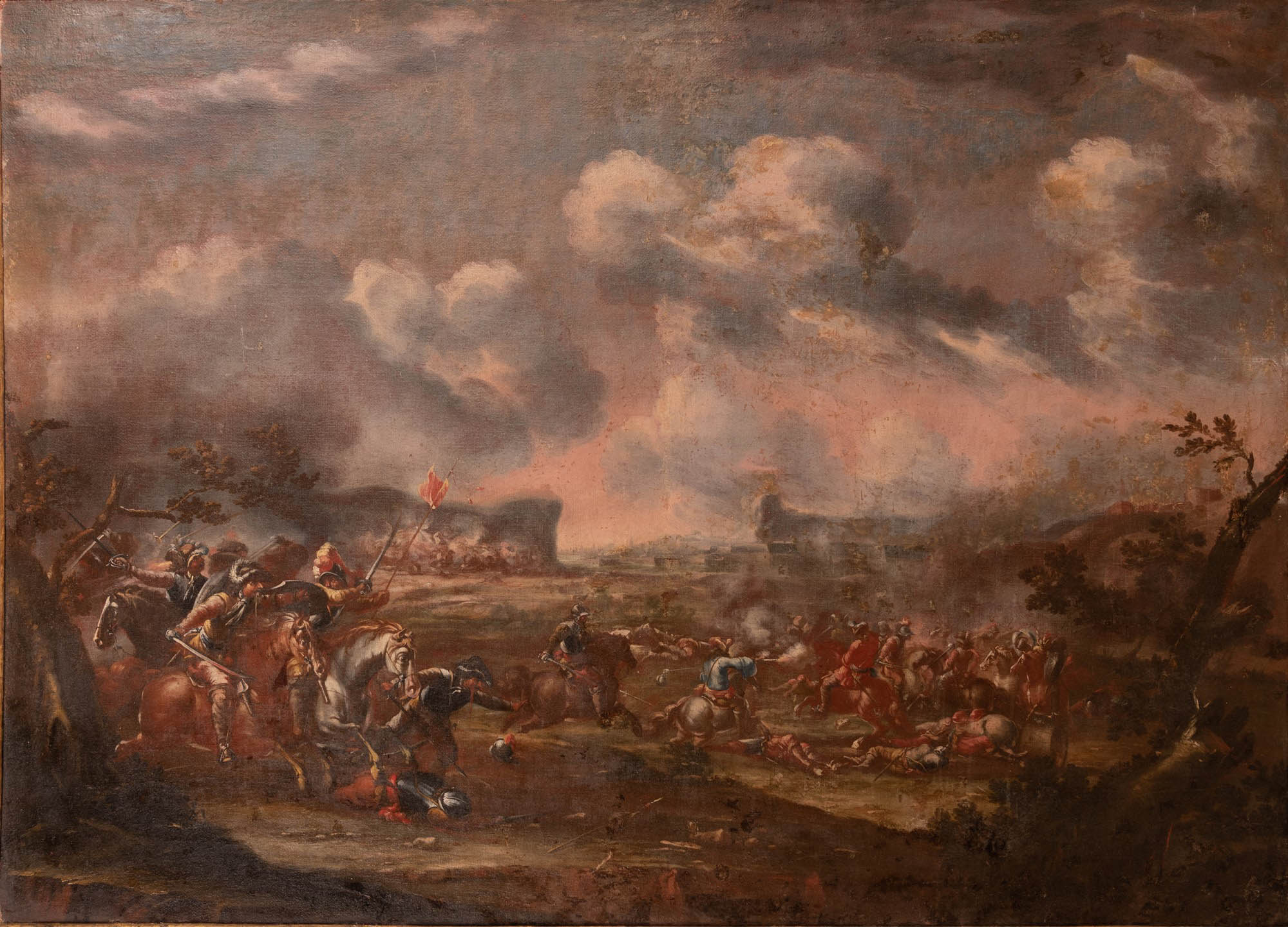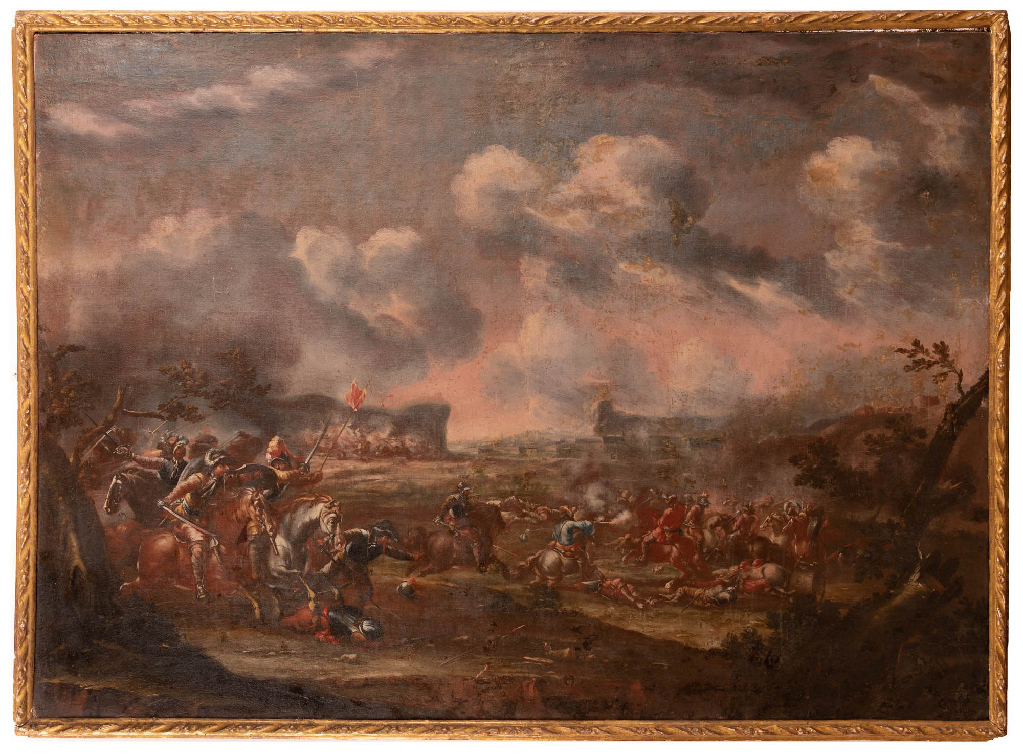 Scuola veneta XVIII secolo ( - ) Scena di battaglia Olio su tela cm 98x135
