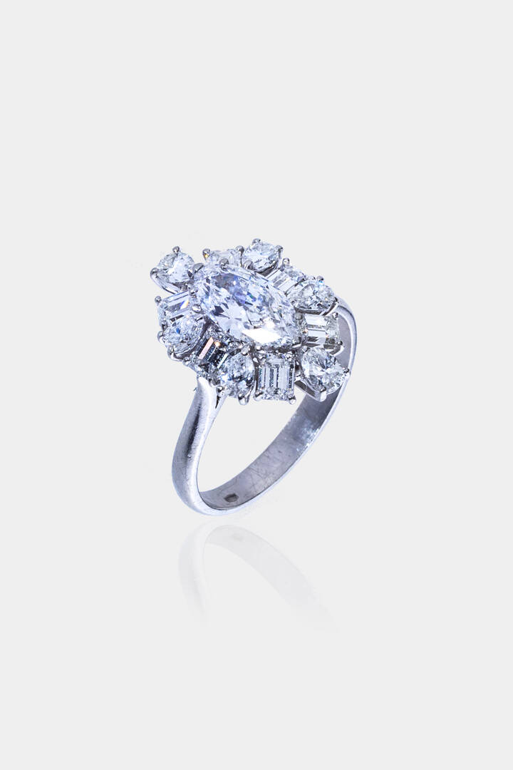 in oro bianco con al centro diamante taglio marquise di ct 1,10 ca, contornata da diamanti taglio a goccia e smeraldo per totali ct 2,0 ca
