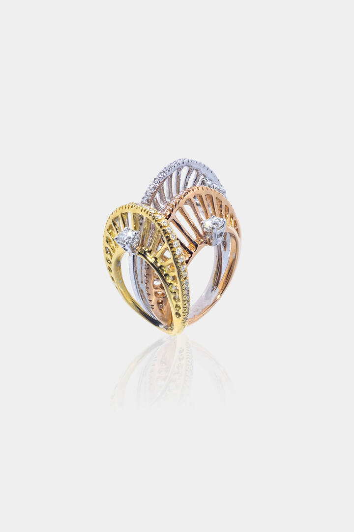 nei tre colori dell'oro sommità bombata traforata con intreccio e diamanti taglio brillante per totali ct 1,04 ca, probabile colore G-H, purezza IF-VVS