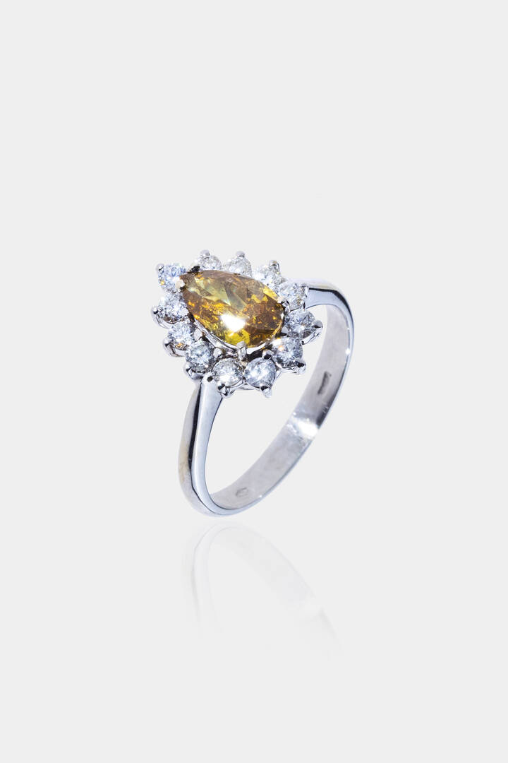 in oro bianco con diamante fancy orangy yellow di ct 1.02, purezza S1, contornato da dodici diamanti taglio brillante per totali ct 0,54 ca, probabile colore G-H, purezza IF-VVS
