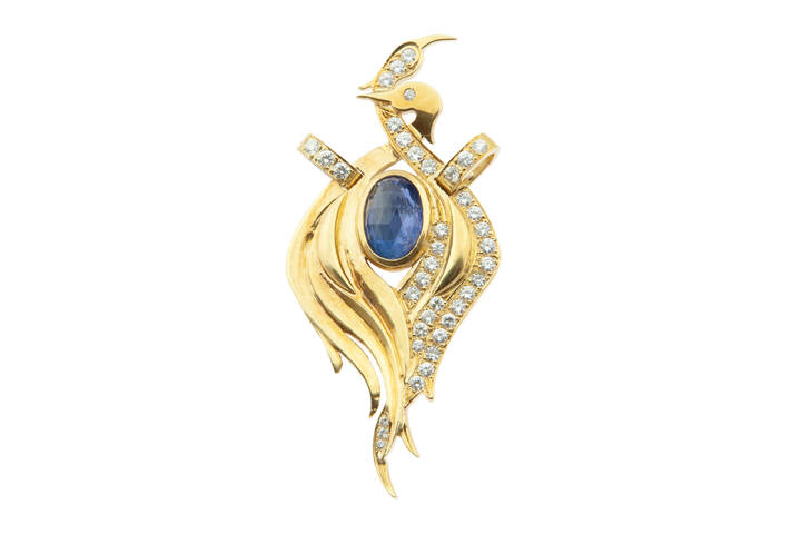 oro giallo, raffigurante due gru intrecciate; al centro zaffiro taglio briolette sintetico di ct 5,0 e diamanti taglio brillante per totale ct 1,0 ca, probabile colore F-G, purezza IF-VVS