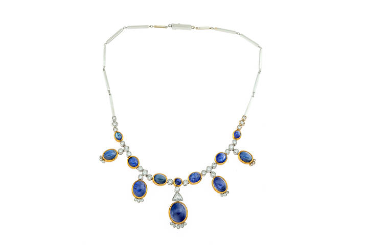 in oro bianco e giallo composto da segmenti rigidi; al centro zaffiri taglio ovale cabochon per totali ct 30,0 ca e diamanti taglio brillante e triangolari per totali ct 2,0 ca, probabile colore G-H, purezza IF-VVS