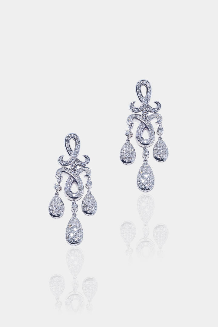 pendenti in oro bianco con corpo lavorato ad arabesco e terminanti con sei gocce, pavé di diamanti per totali ct 2,0 ca, probabile colore G-H, purezza IF-VVS