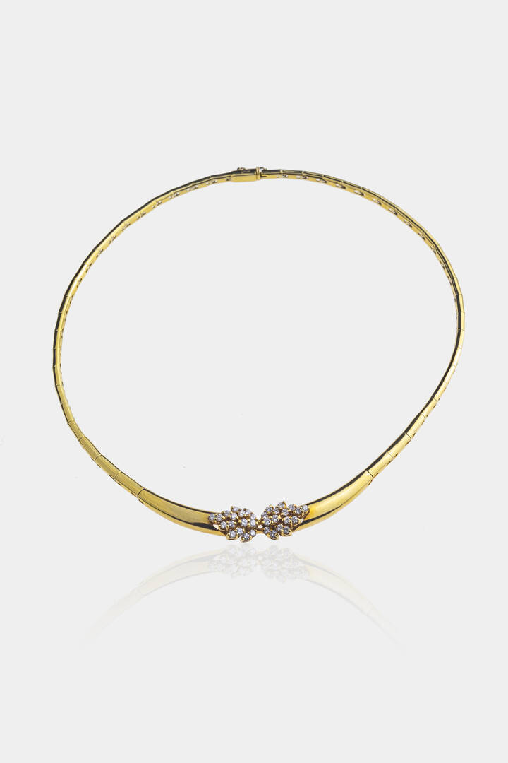Girocollo composto da segmenti in oro giallo, firmato "Damiani", al centro fiori con diamanti taglio brillante per totali ct 0,65 ca