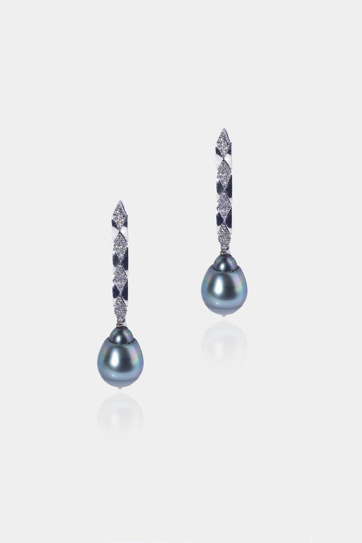 con corpo rigido in oro bianco impreziosito da diamanti taglio brillante per totali ct 0,40 ca, terminanti con due perle Tahiti scaramazze